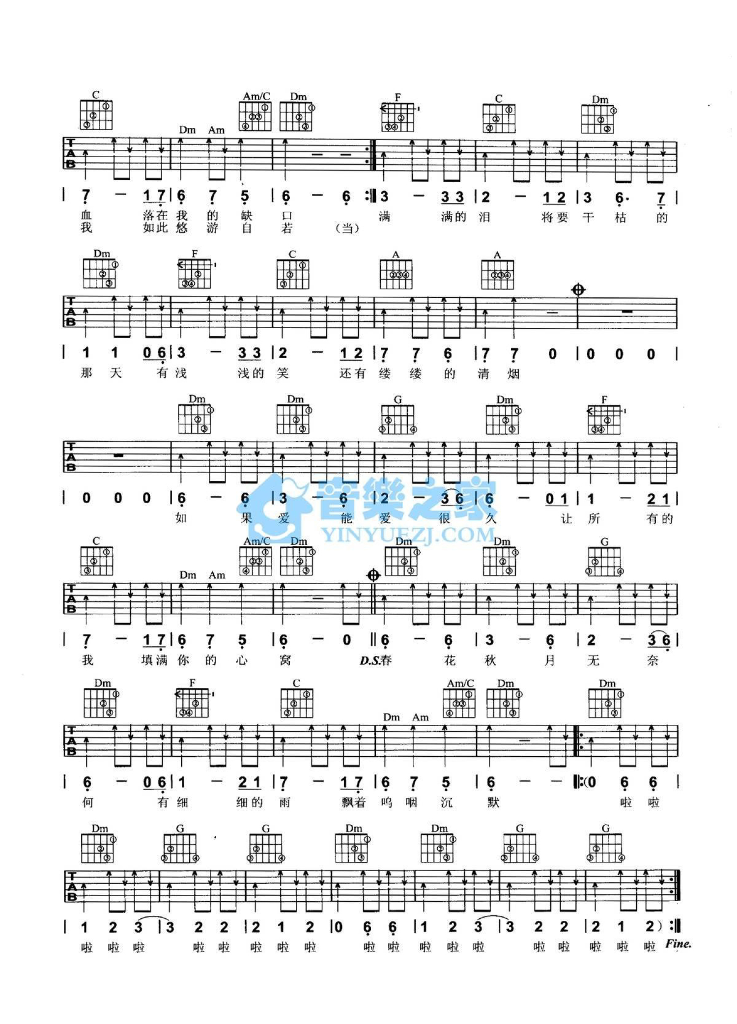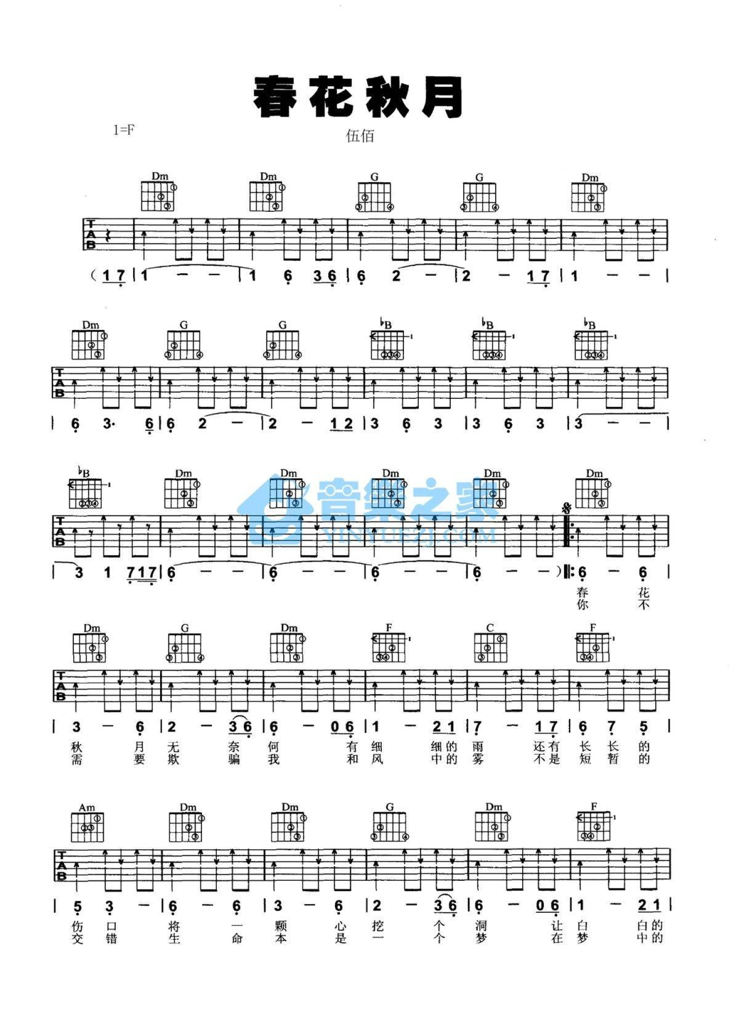 曲谱介绍: F调版 伍佰《春花秋月》吉他弹唱六线谱