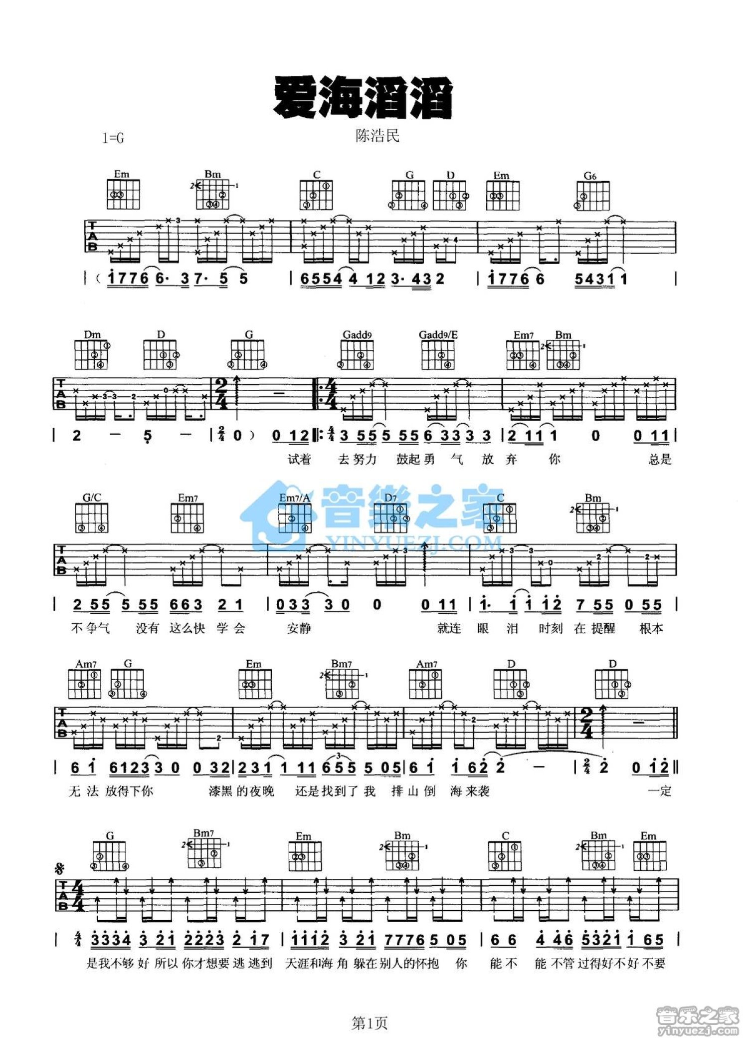 曲谱介绍: G调版 陈浩民《爱海滔滔》吉他弹唱六线谱