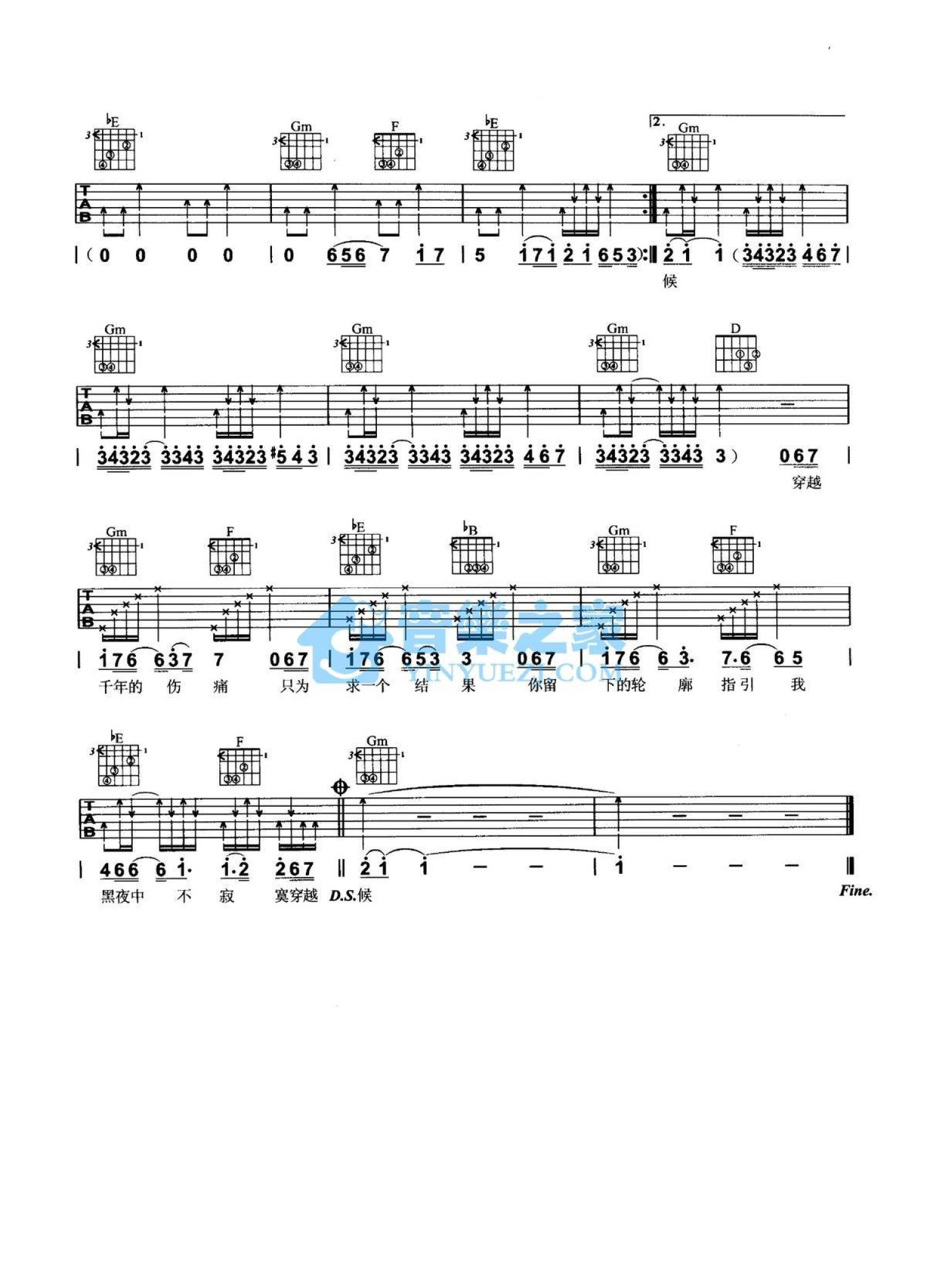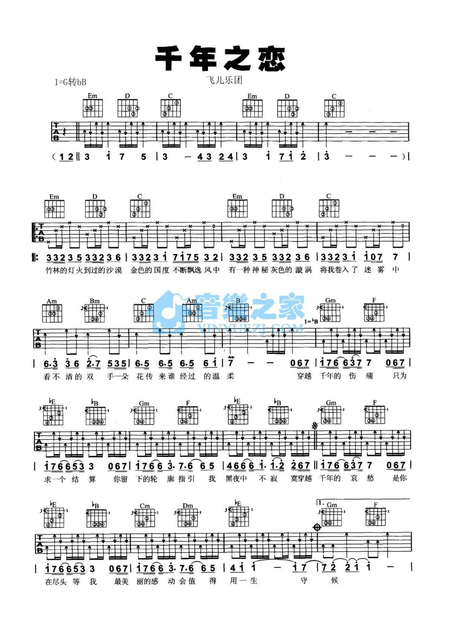 曲谱介绍: G转bB调版《千年之恋》吉他弹唱六线谱