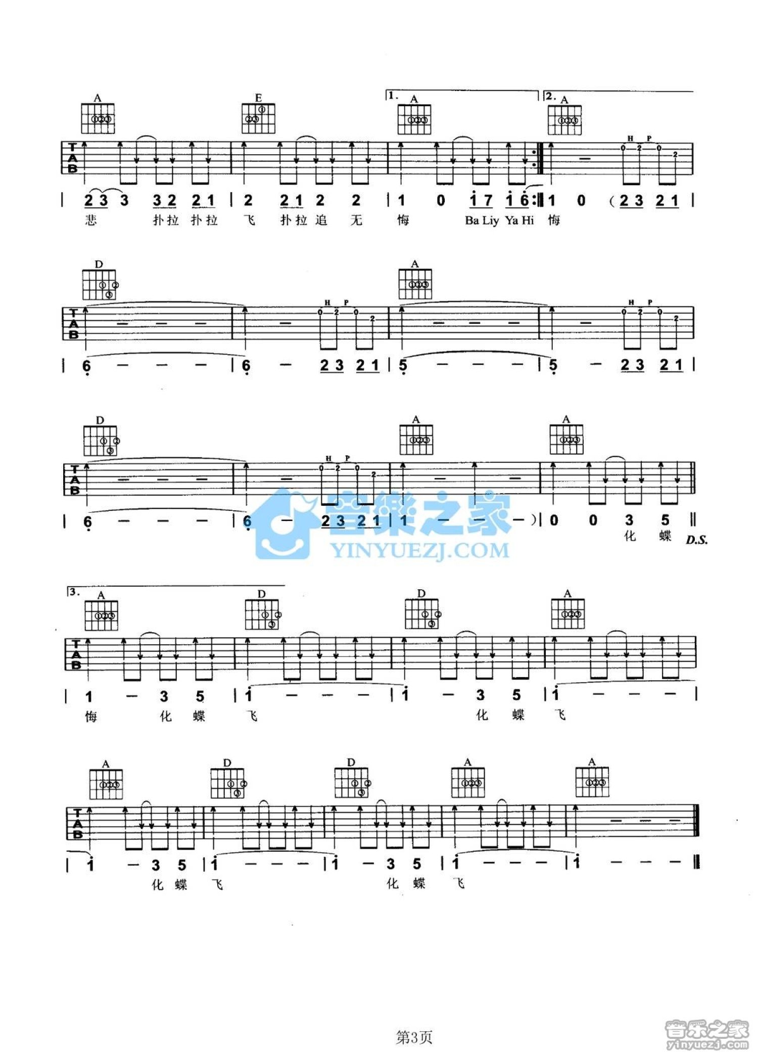 曲谱介绍: A调版《化蝶飞》吉他弹唱六线谱