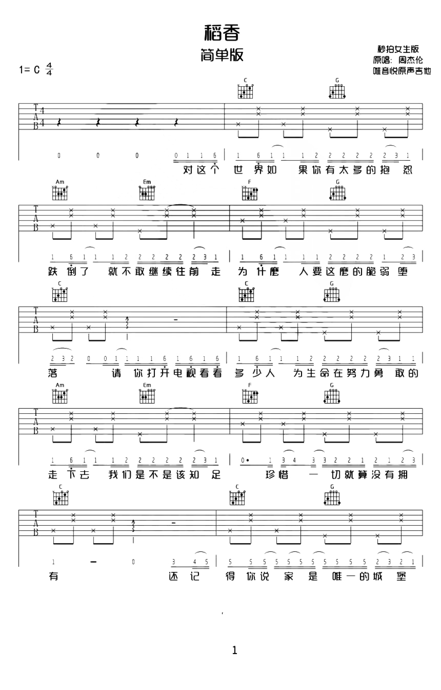 稻香吉他谱 - 周杰伦 - C调吉他弹唱谱