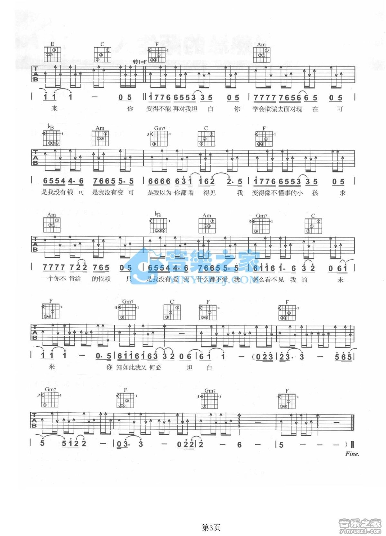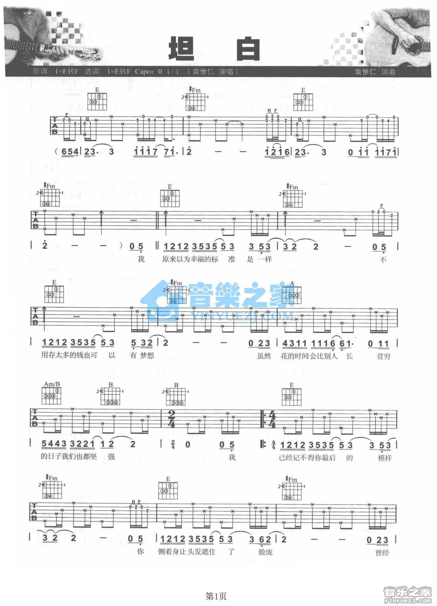 曲谱介绍: E转F调版 袁惟仁《坦白》吉他弹唱六线谱