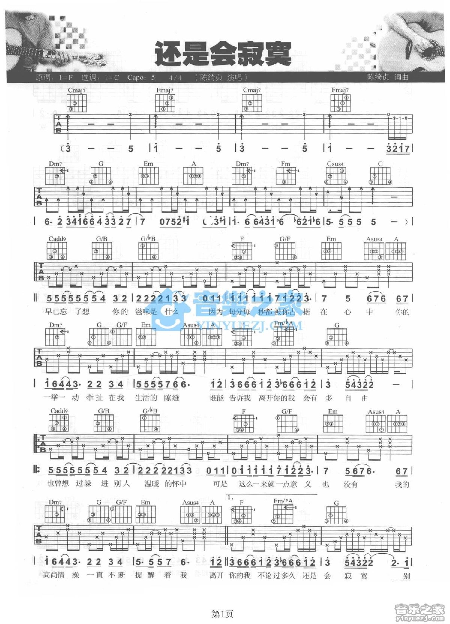曲谱介绍: C调版《还是会寂寞》吉他弹唱六线谱