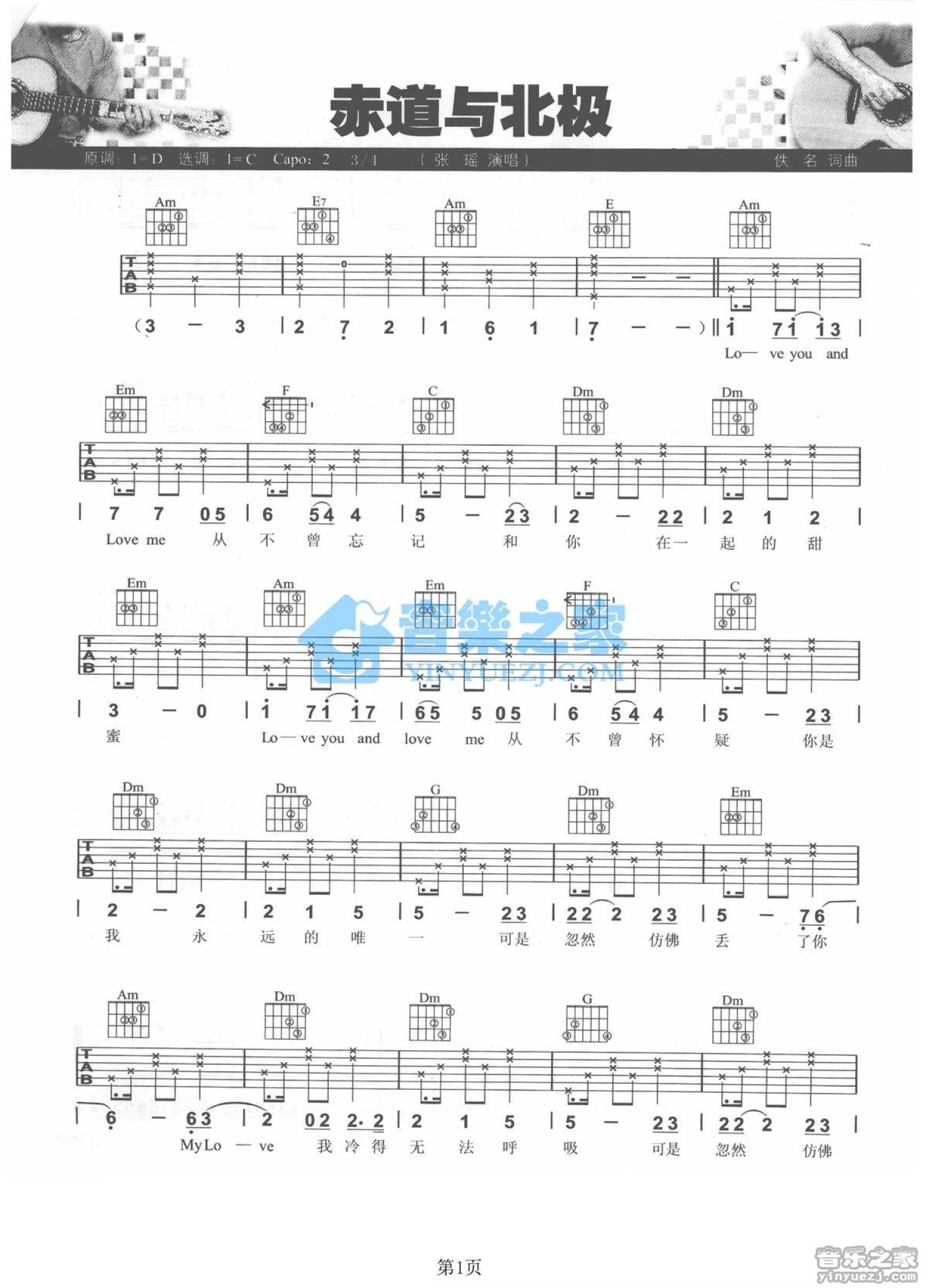 曲谱介绍: C调版卢西《赤道与北极》吉他弹唱六线谱