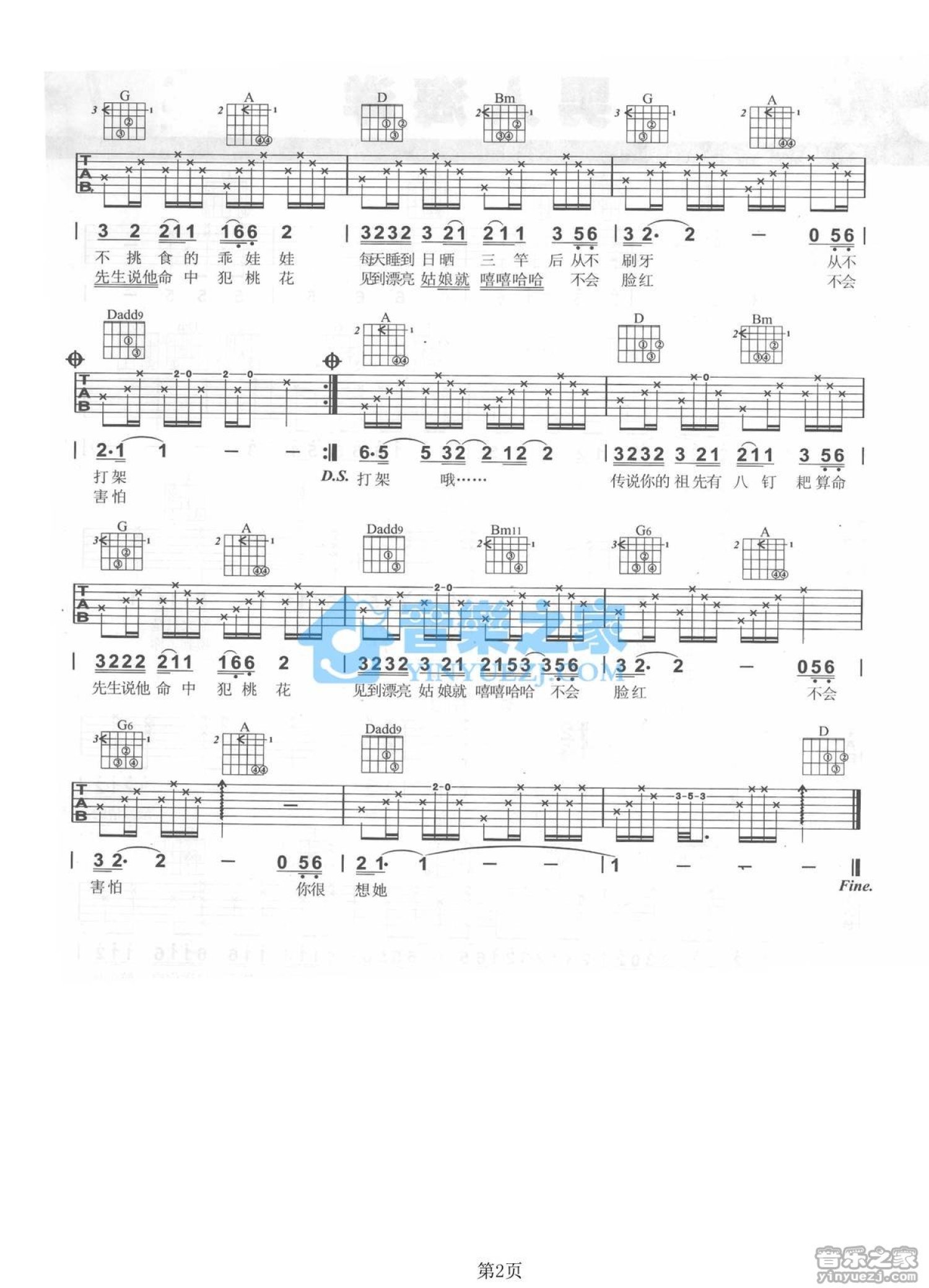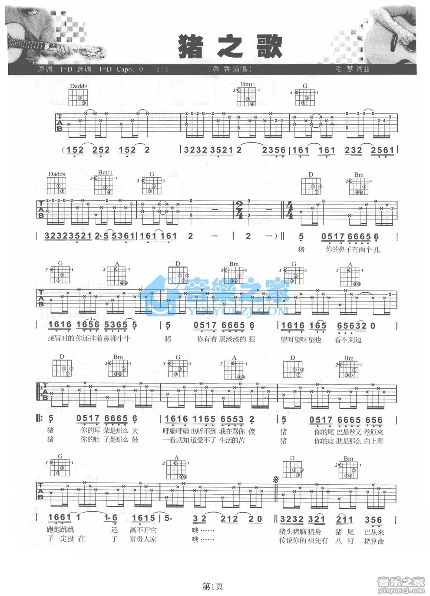 曲谱介绍: D调版《猪之歌》吉他弹唱六线谱