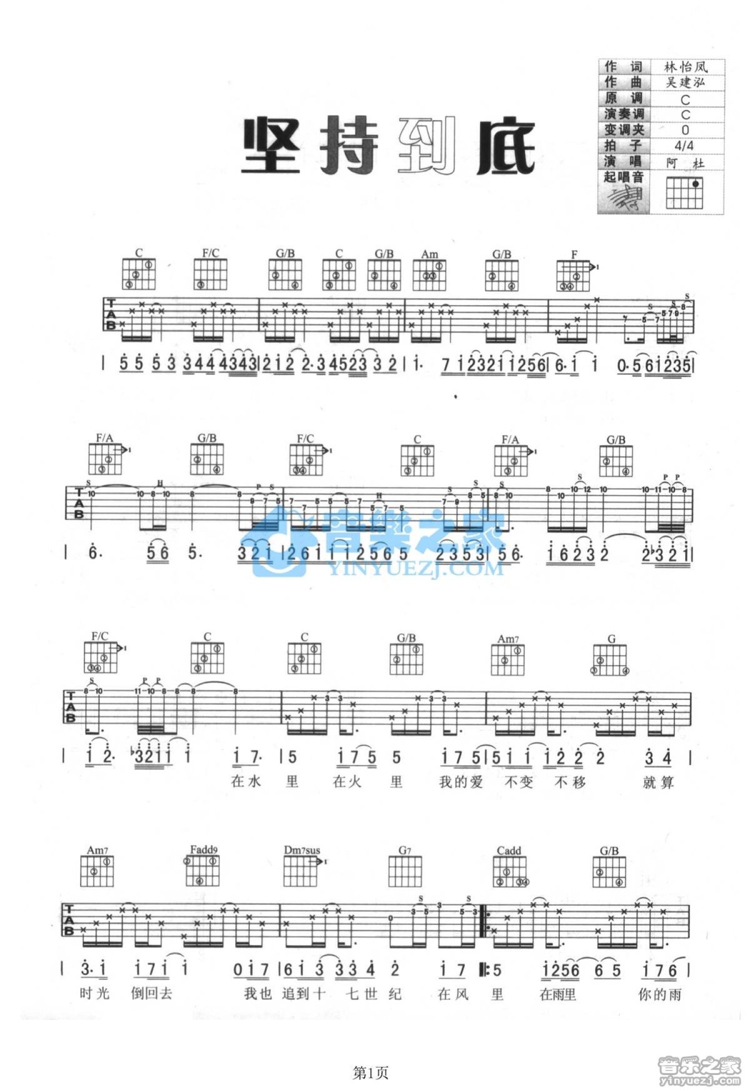 曲谱介绍: C调版 阿杜《坚持到底》吉他弹唱六线谱