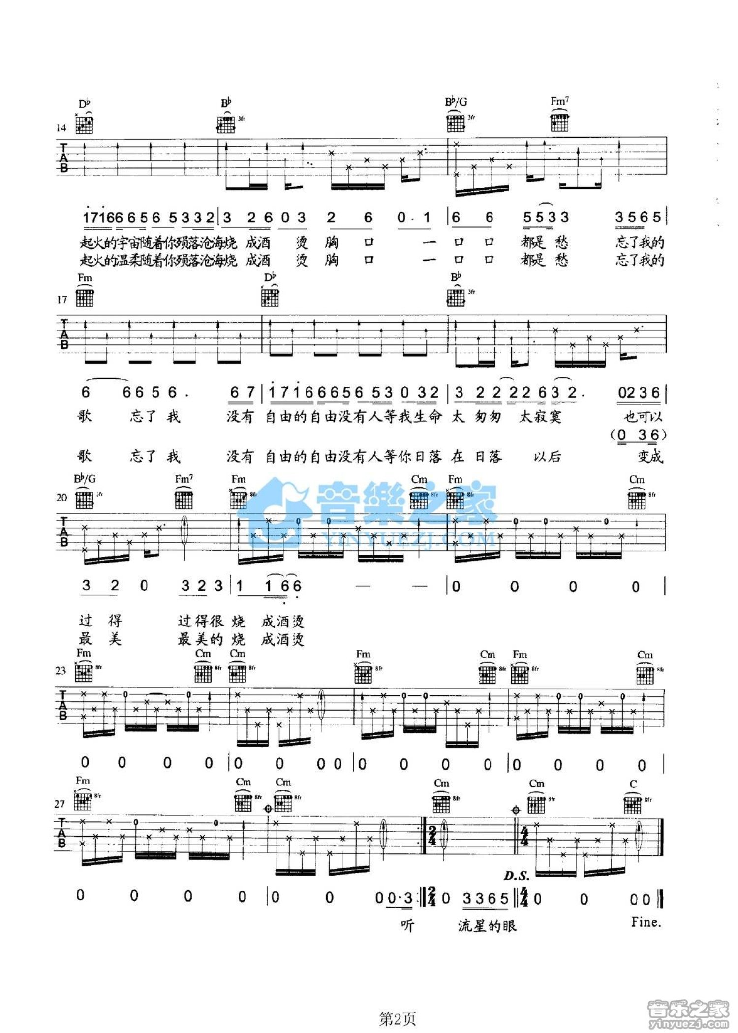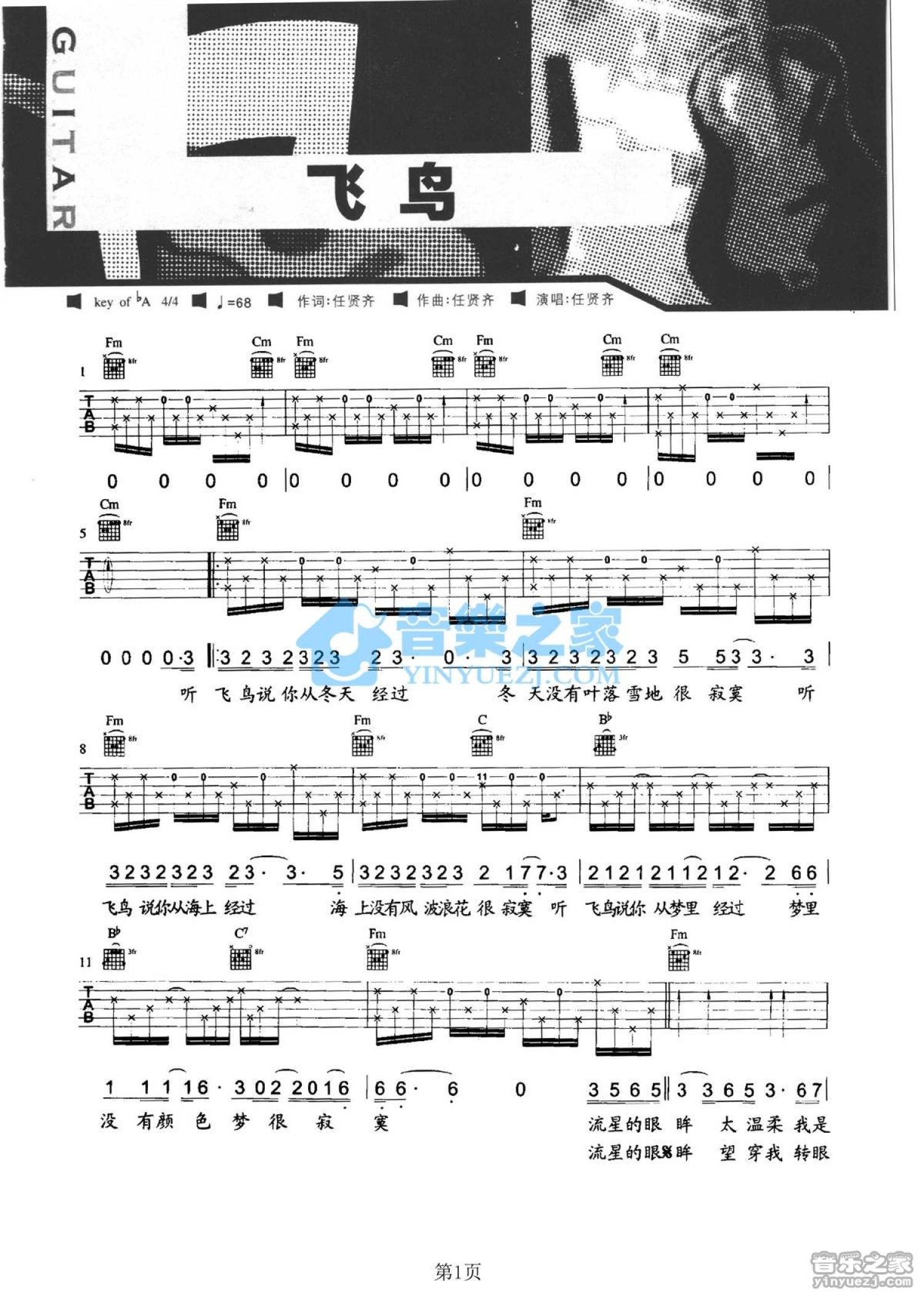曲谱介绍: bA调版 任贤齐《飞鸟》吉他弹唱六线谱