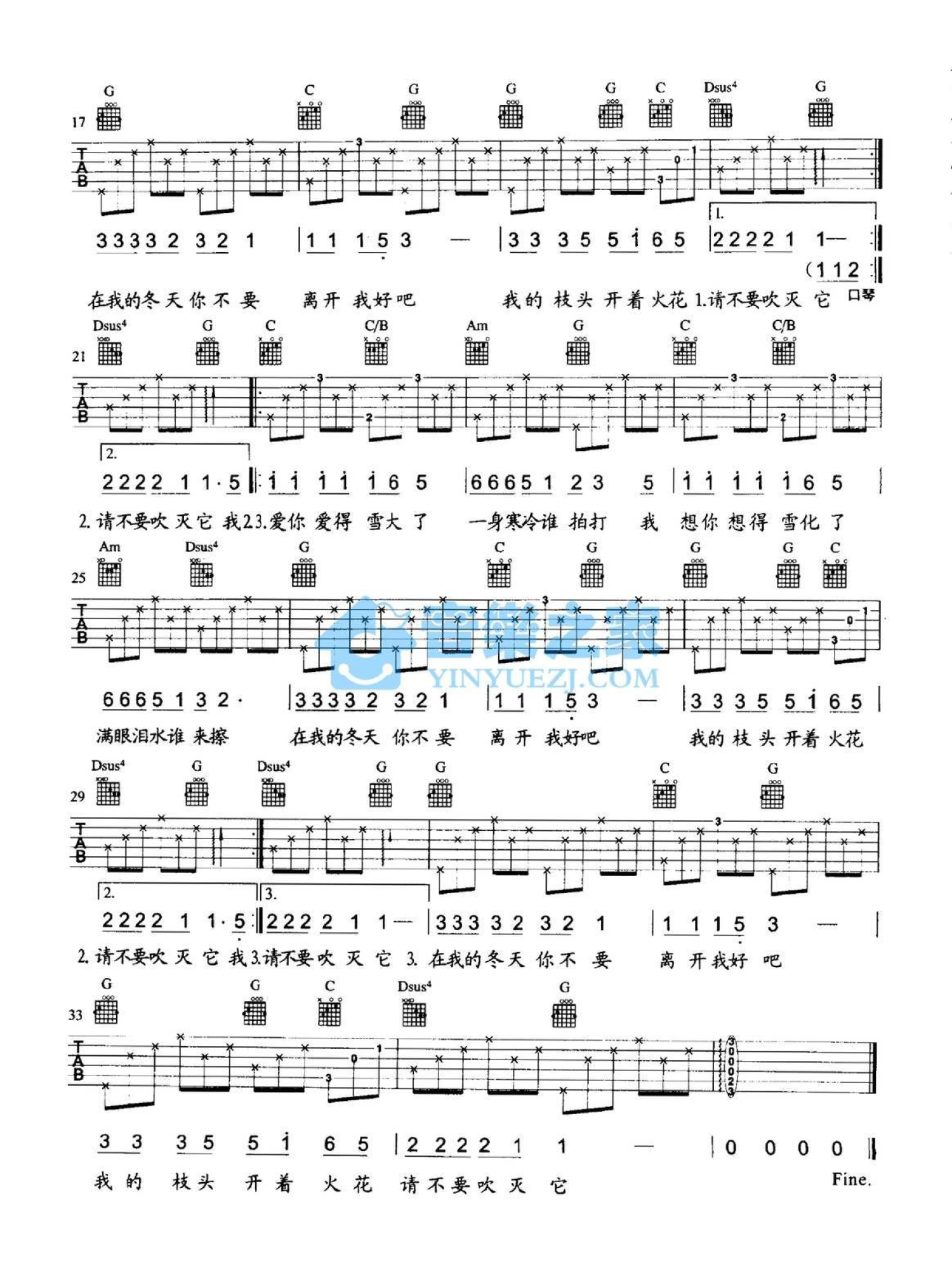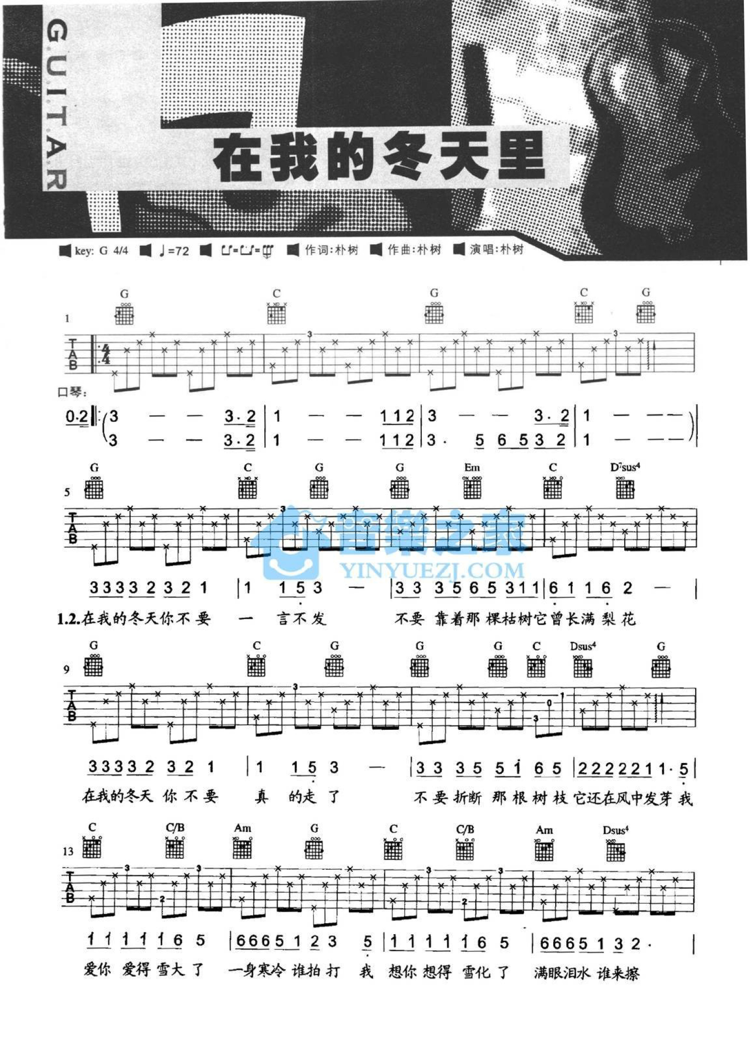 曲谱介绍: G调版 朴树《在我的冬天里》吉他弹唱六线谱