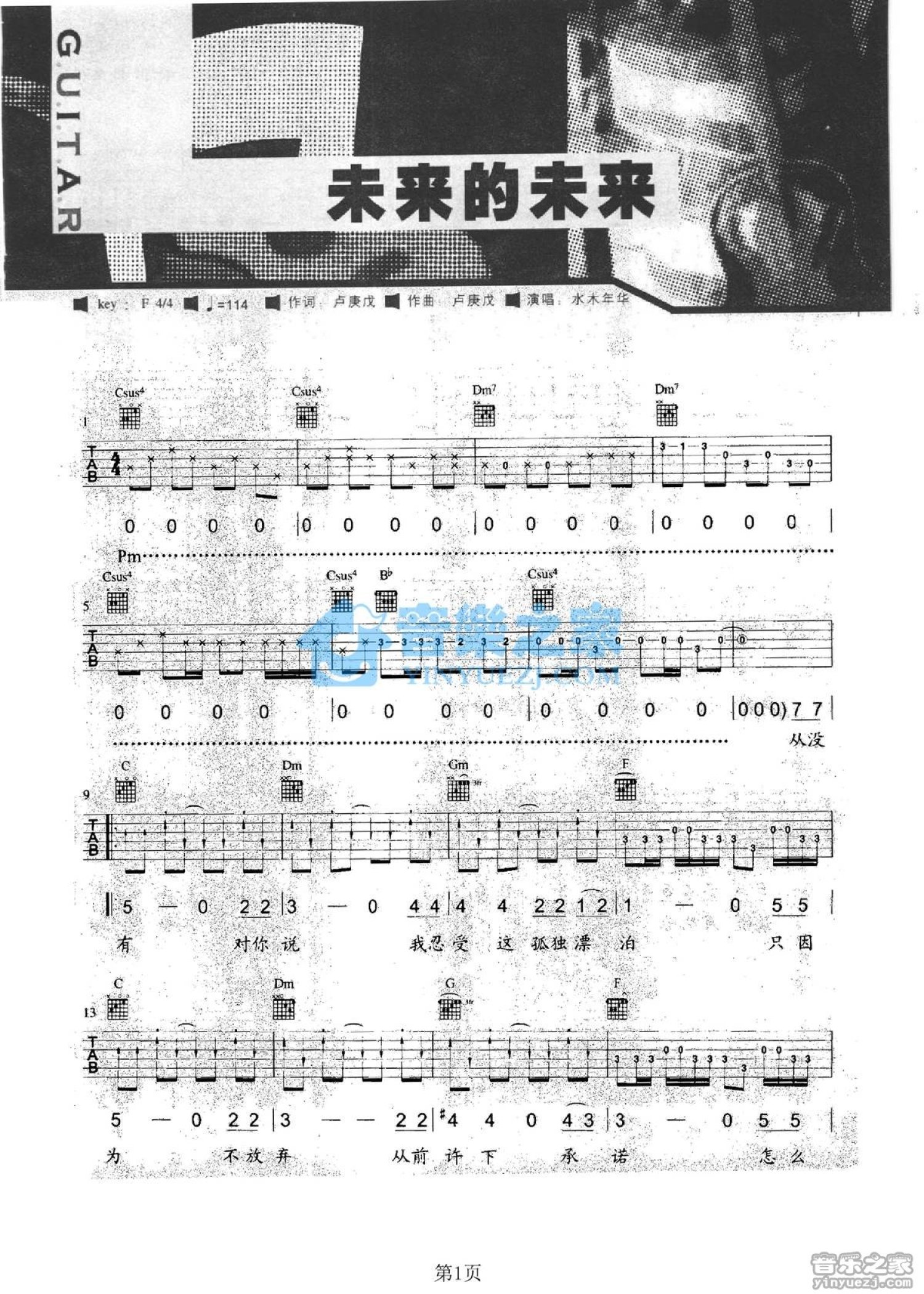 曲谱介绍: F调版 水木年华《未来的未来》吉他弹唱六线谱