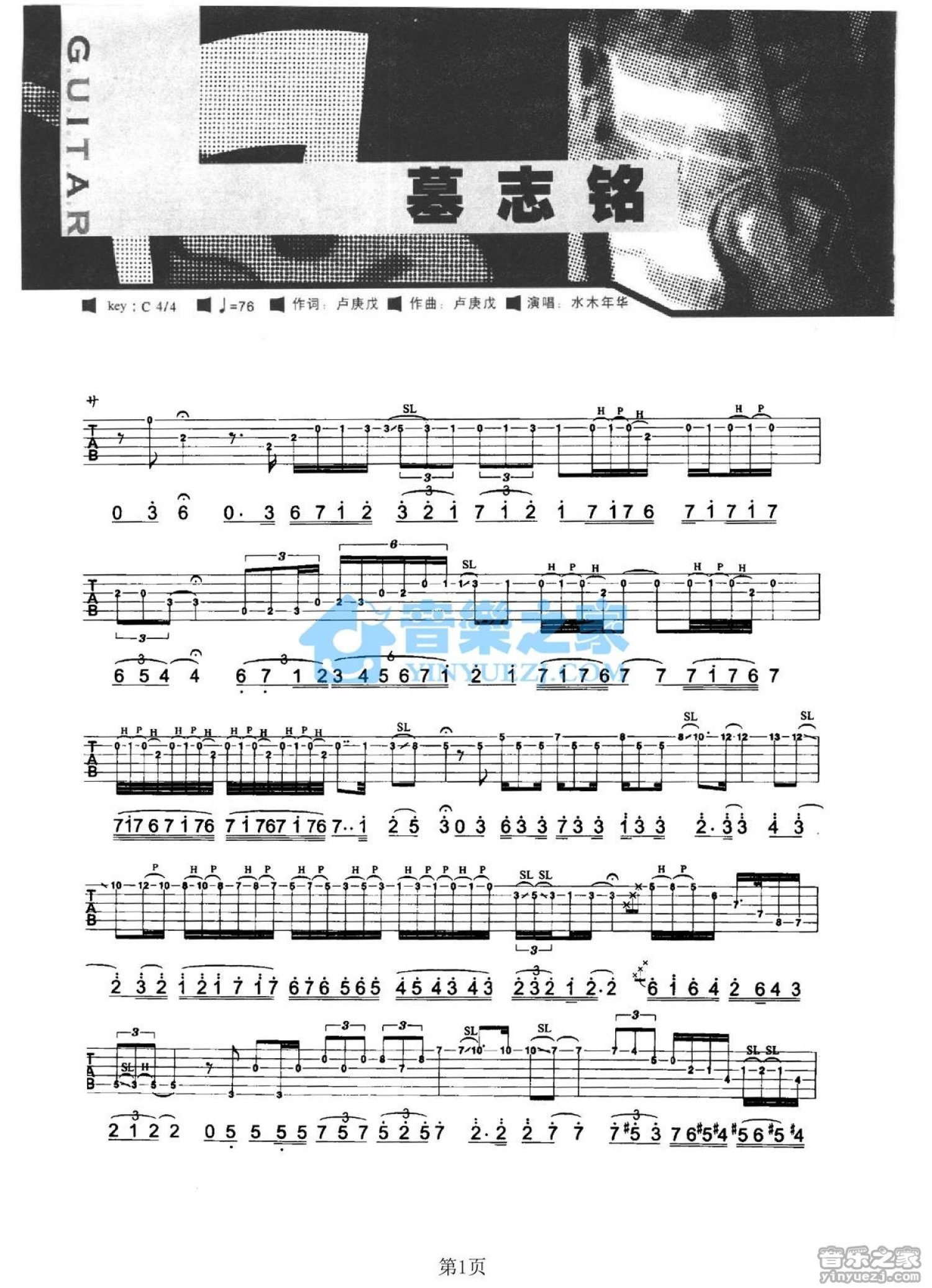 曲谱介绍: C调版 水木年华《墓志铭》吉他弹唱六线谱