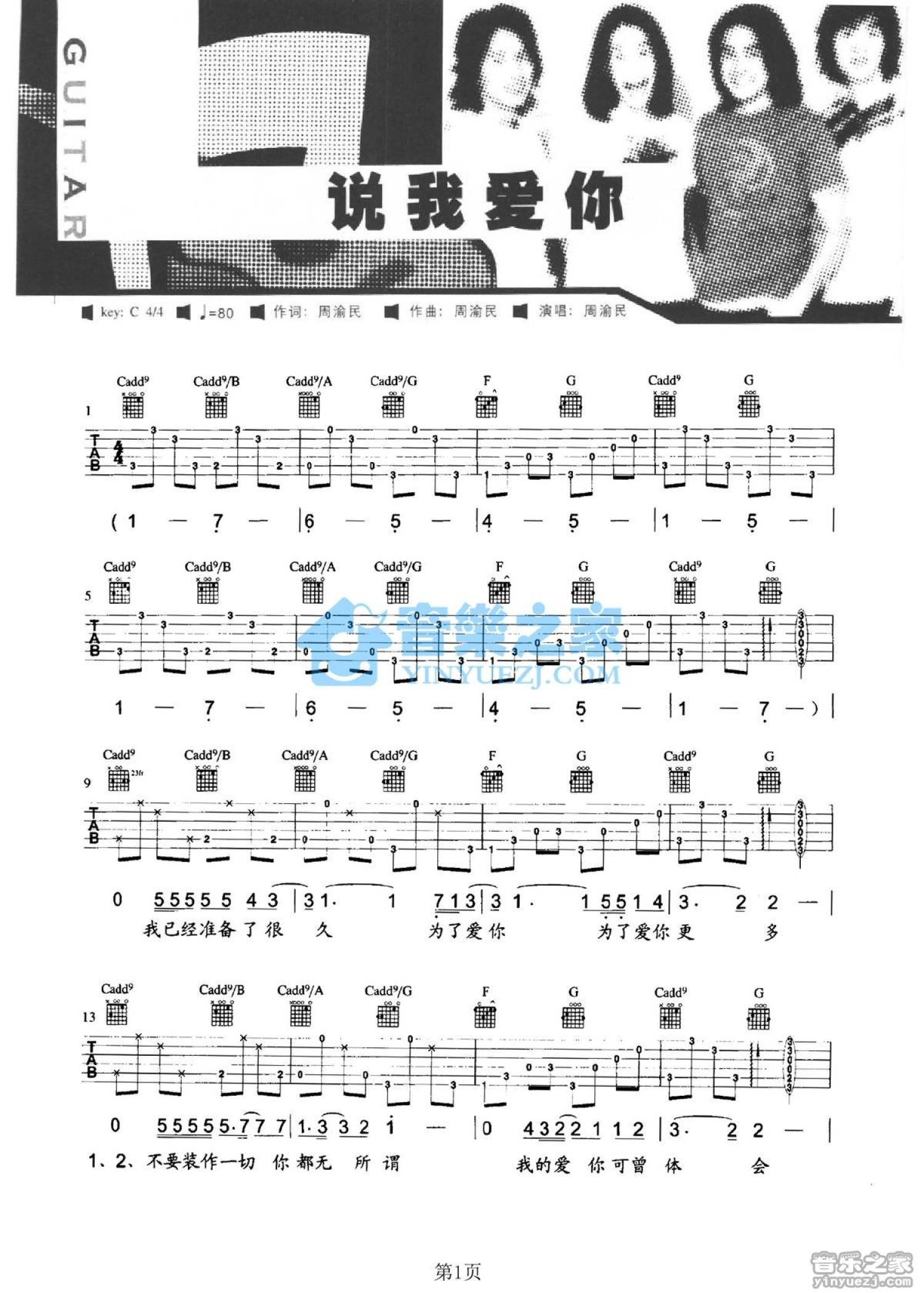曲谱介绍: C调版 周渝民《说我爱你》吉他弹唱六线谱