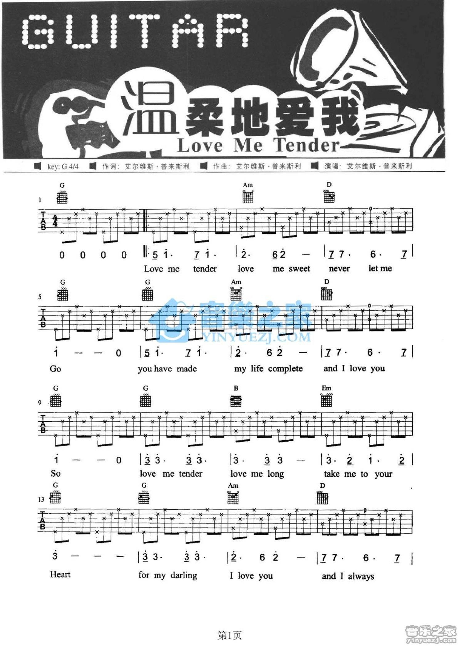 曲谱介绍: G调版艾尔维斯《LoveMeTender》吉他弹唱六线谱