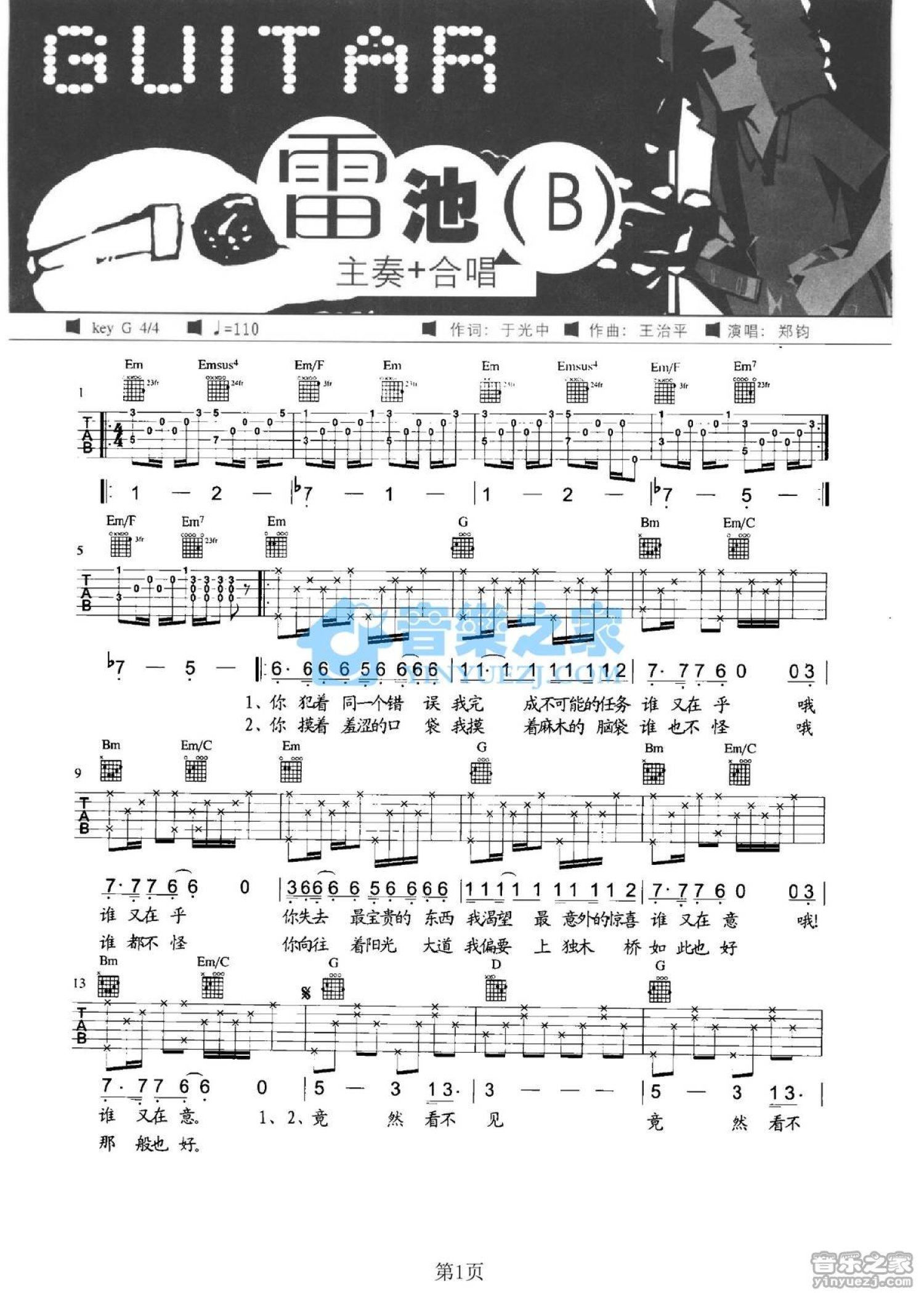 曲谱介绍: 主唱+合唱G调版郑钧《雷池B》吉他弹唱六线谱
