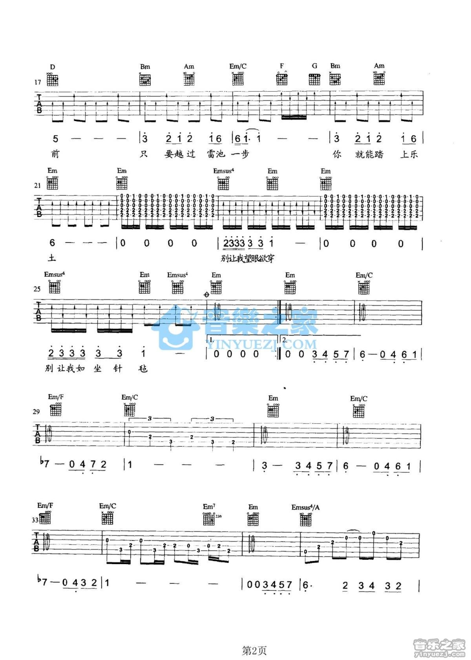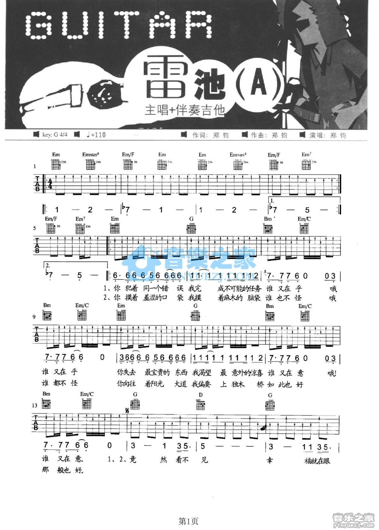 曲谱介绍: 主唱+伴奏吉他G调版郑钧《雷池(A)》吉他弹唱六线谱