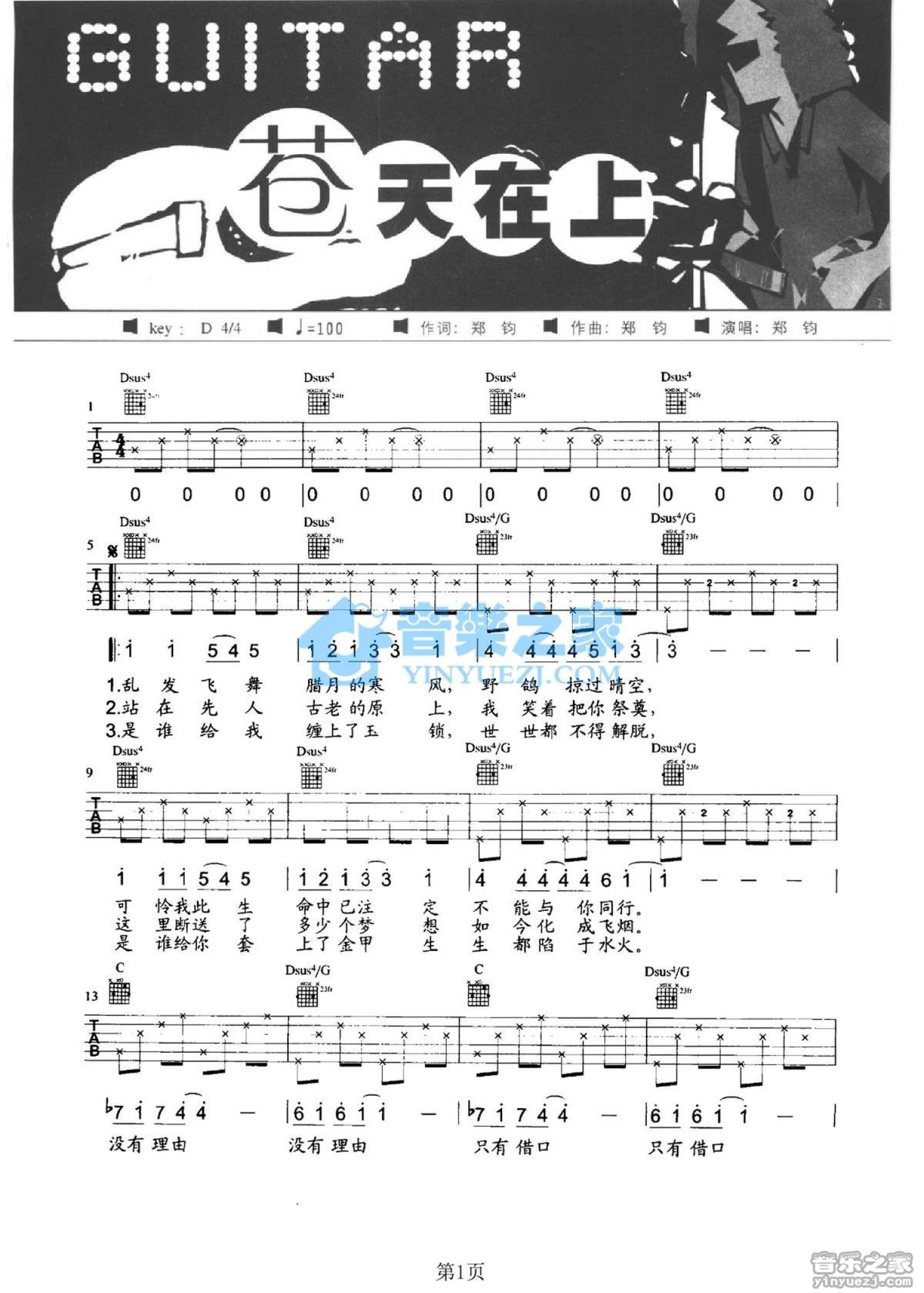 曲谱介绍: D调版 郑钧《苍天在上》吉他弹唱六线谱