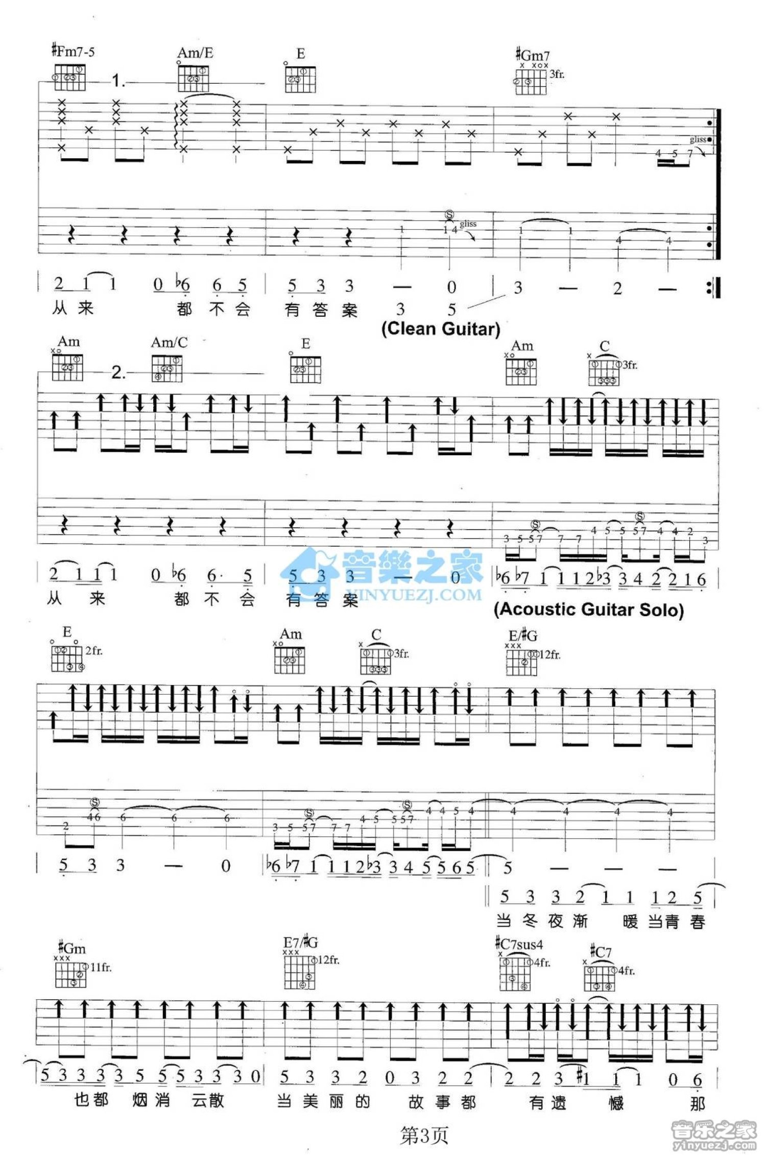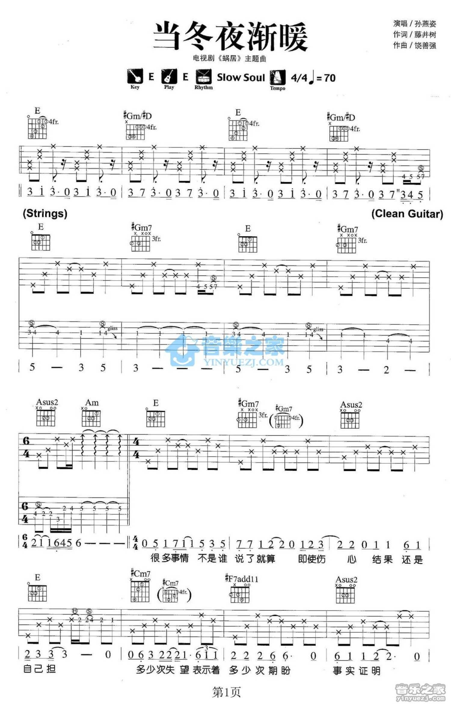 曲谱介绍: E调双吉他版 孙燕姿《当冬夜渐暖》吉他弹唱六线谱