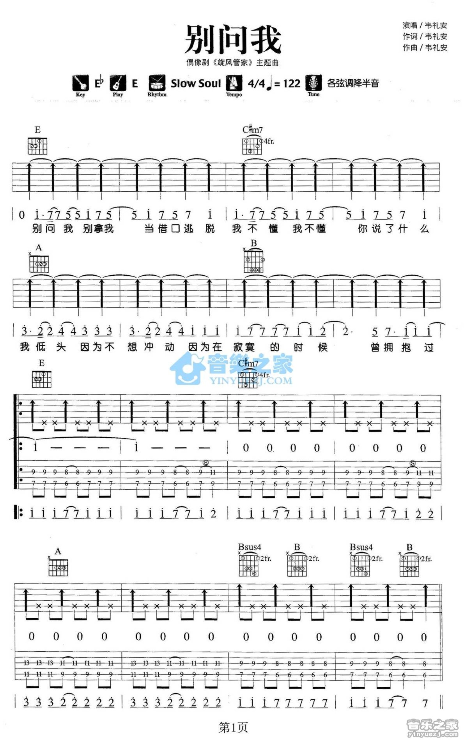 曲谱介绍: E调双吉他版 韦礼安《别问我》吉他弹唱六线谱