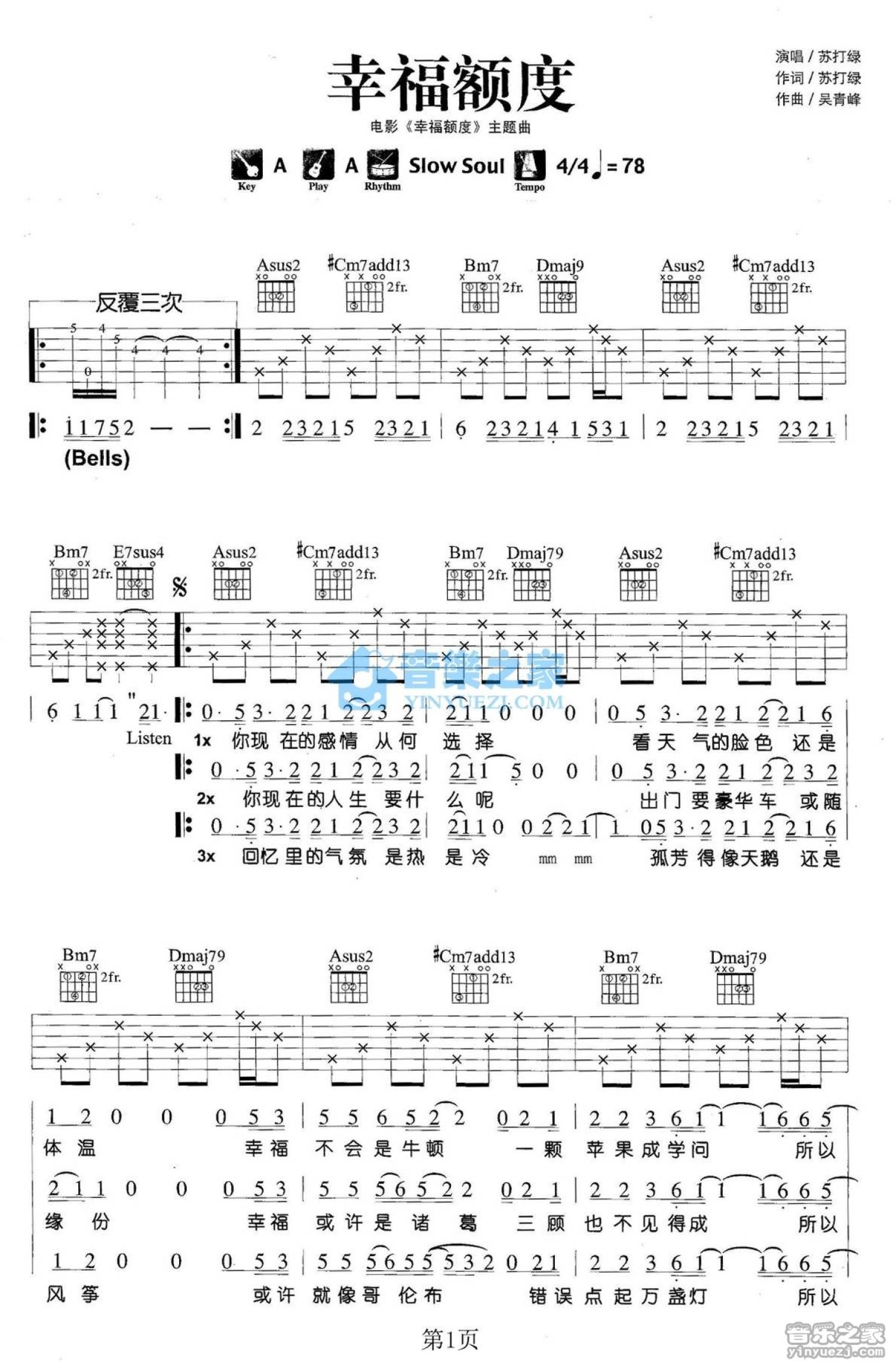 曲谱介绍: A调版 苏打绿《幸福额度》吉他弹唱六线谱