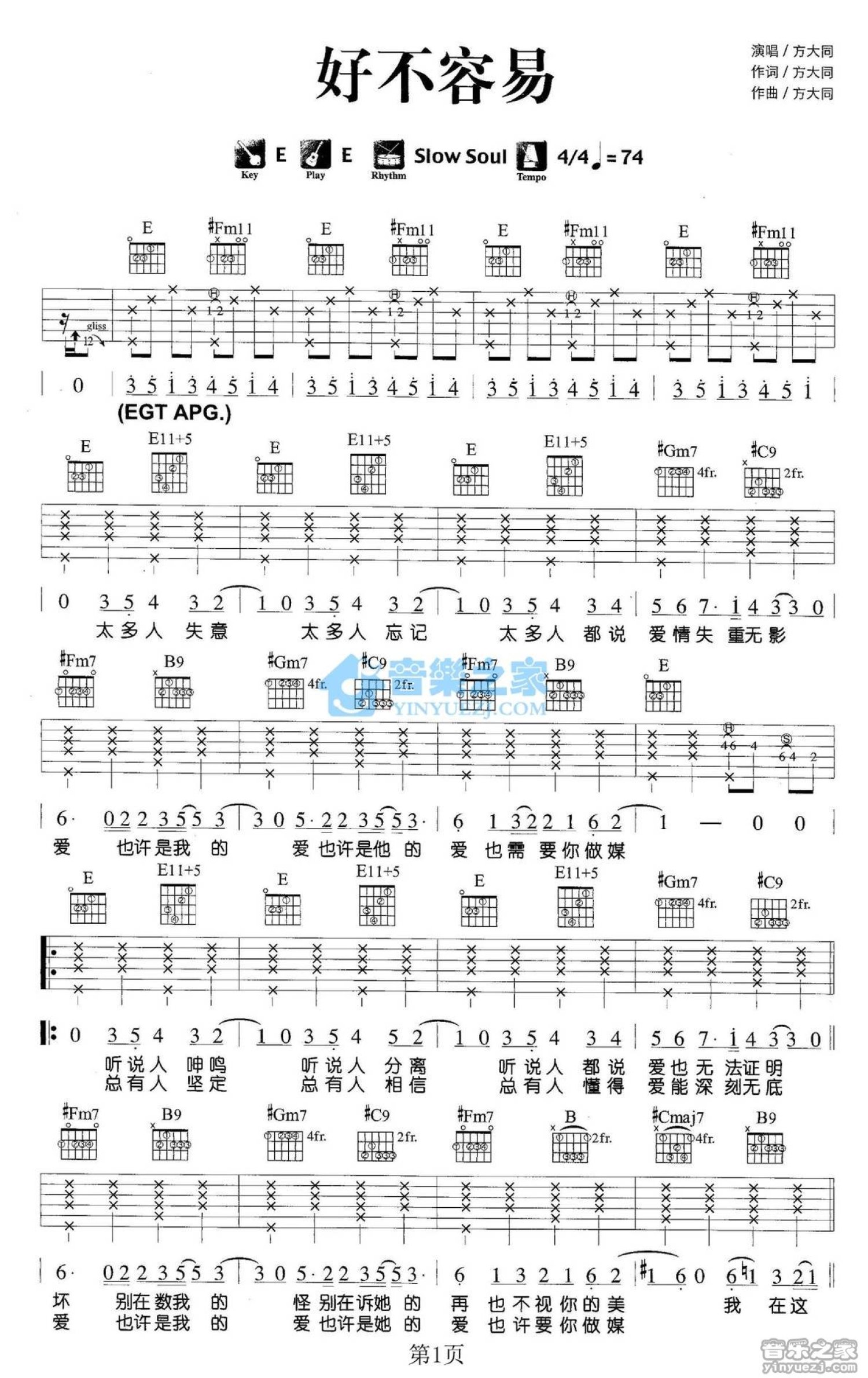 曲谱介绍: E调版 方大同《好不容易》吉他弹唱六线谱