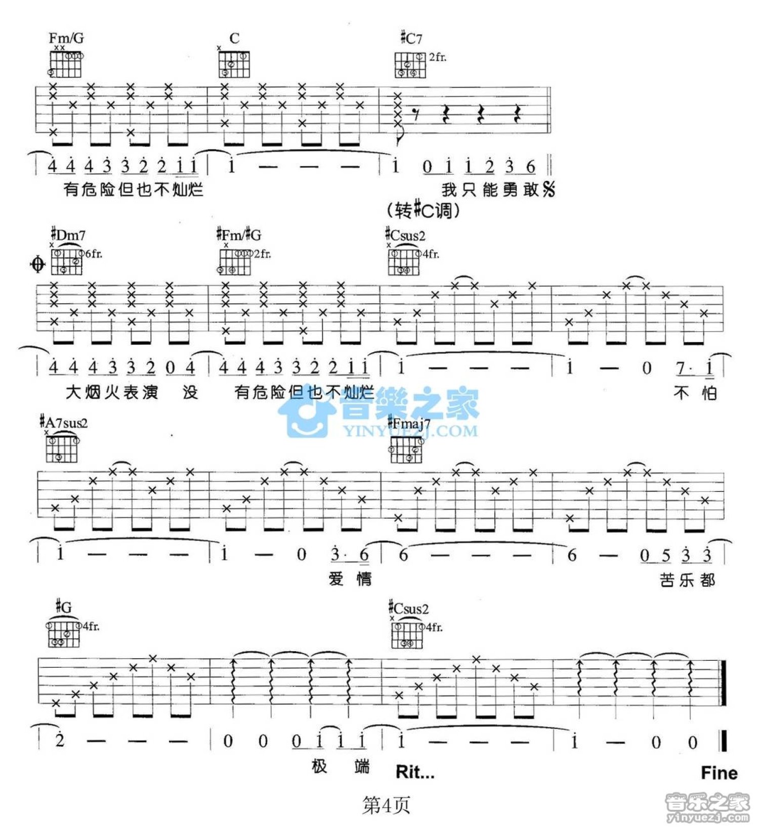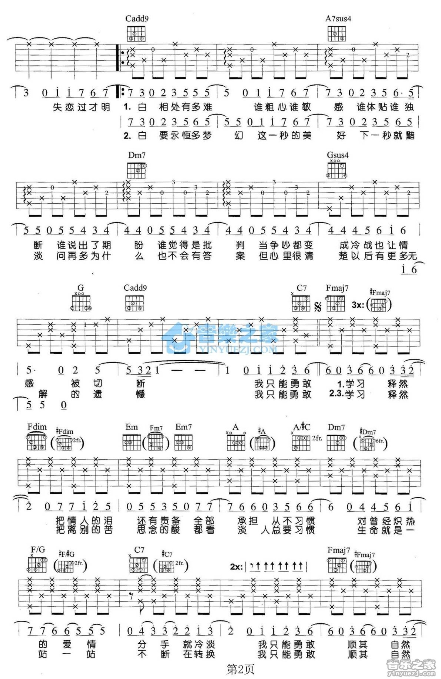 曲谱介绍: C调版《只能勇敢》吉他弹唱六线谱