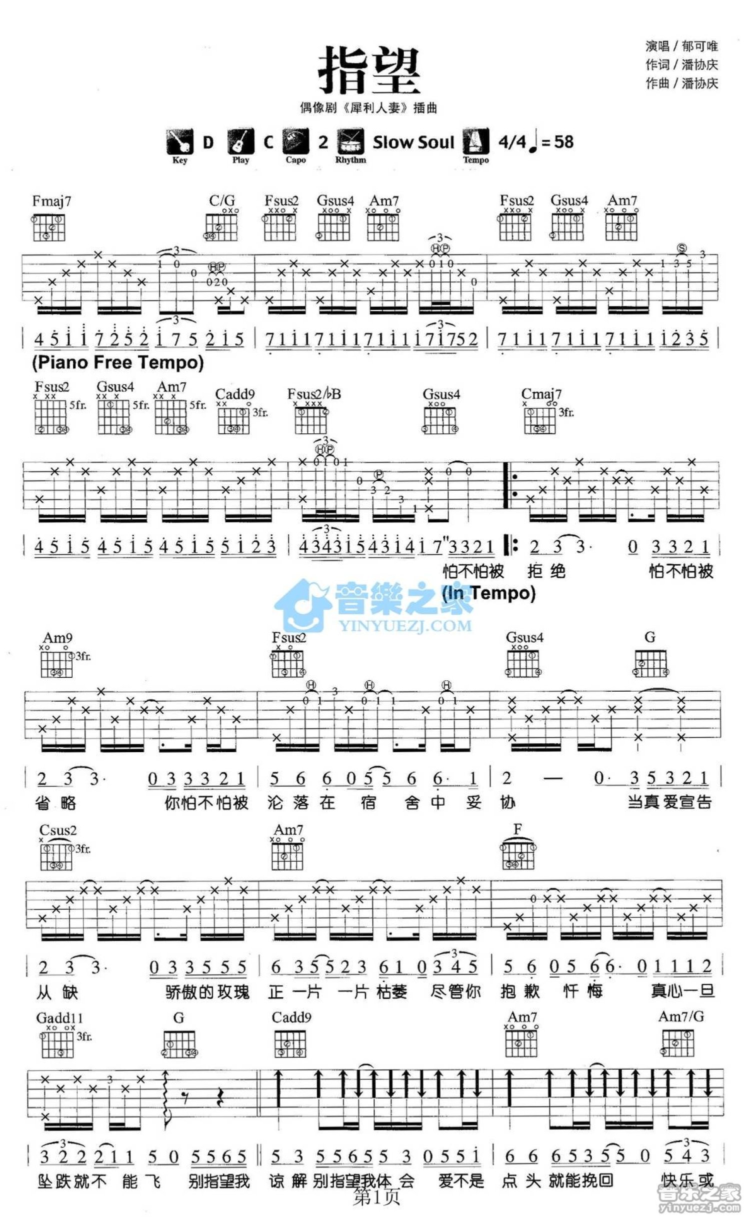 曲谱介绍: 卢家宏C调版 郁可唯《指望》吉他弹唱六线谱