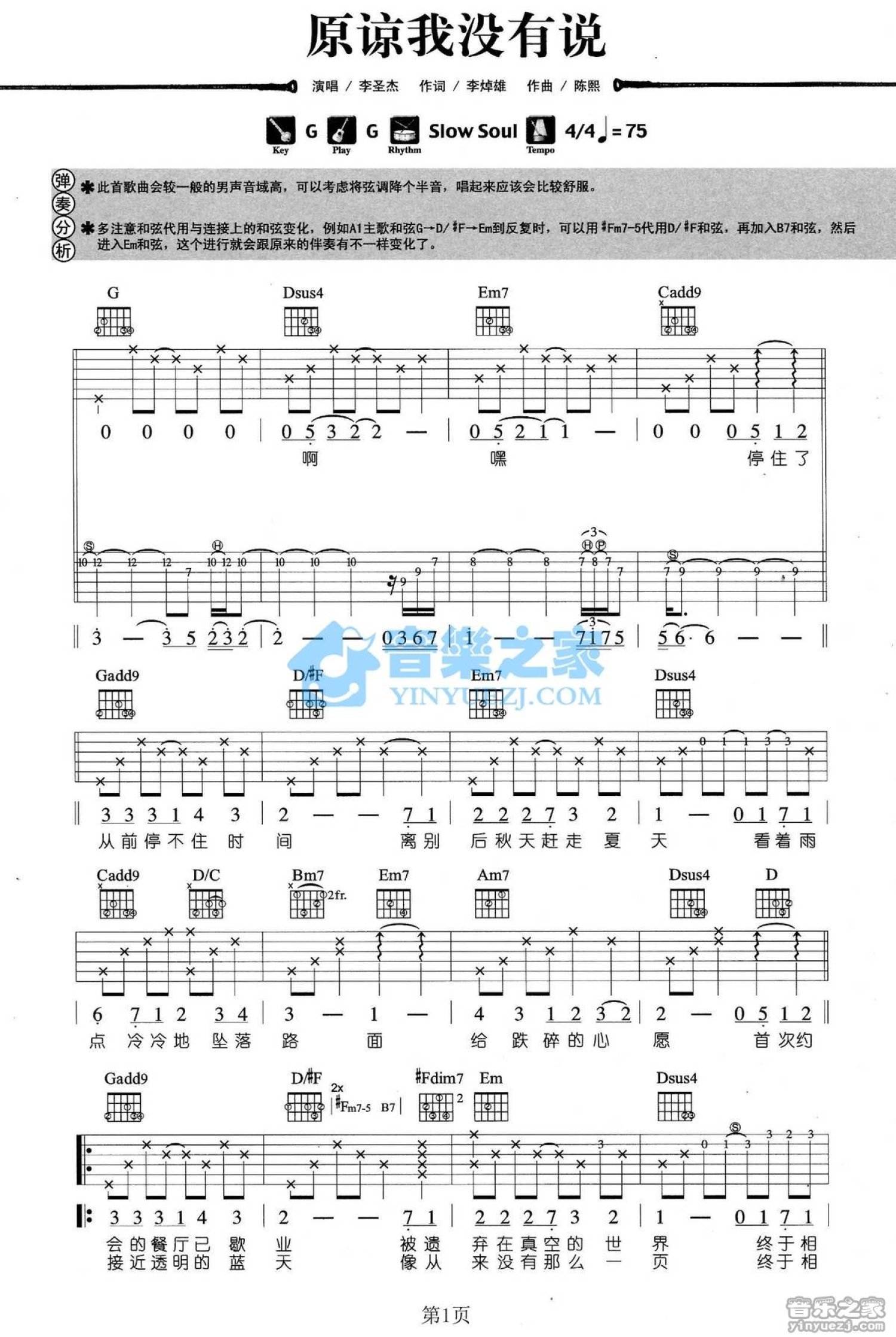 曲谱介绍: G调双吉他版李圣杰《原谅我没有说》吉他弹唱六线谱