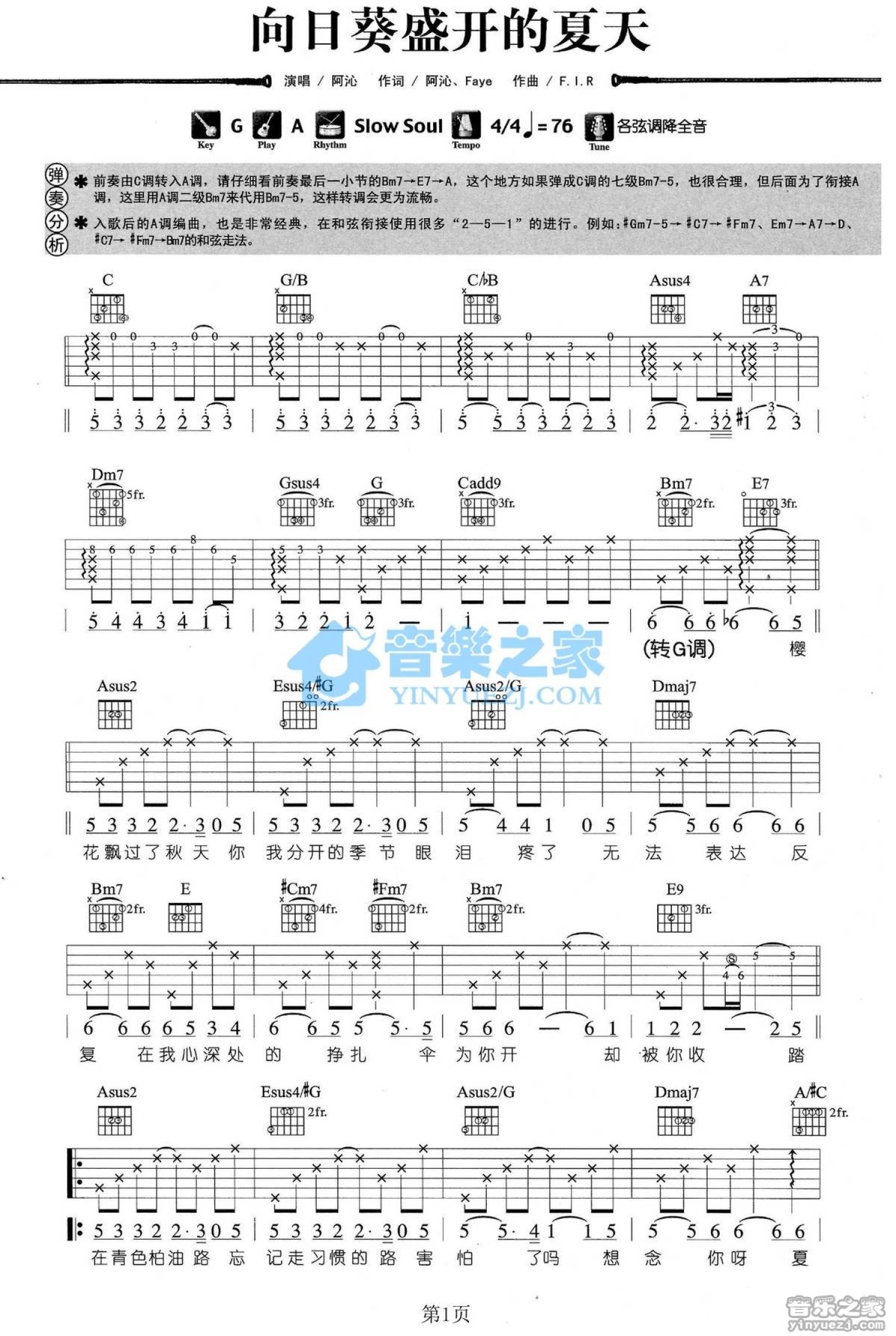 曲谱介绍: A调版《向日葵盛开的夏天》吉他弹唱六线谱