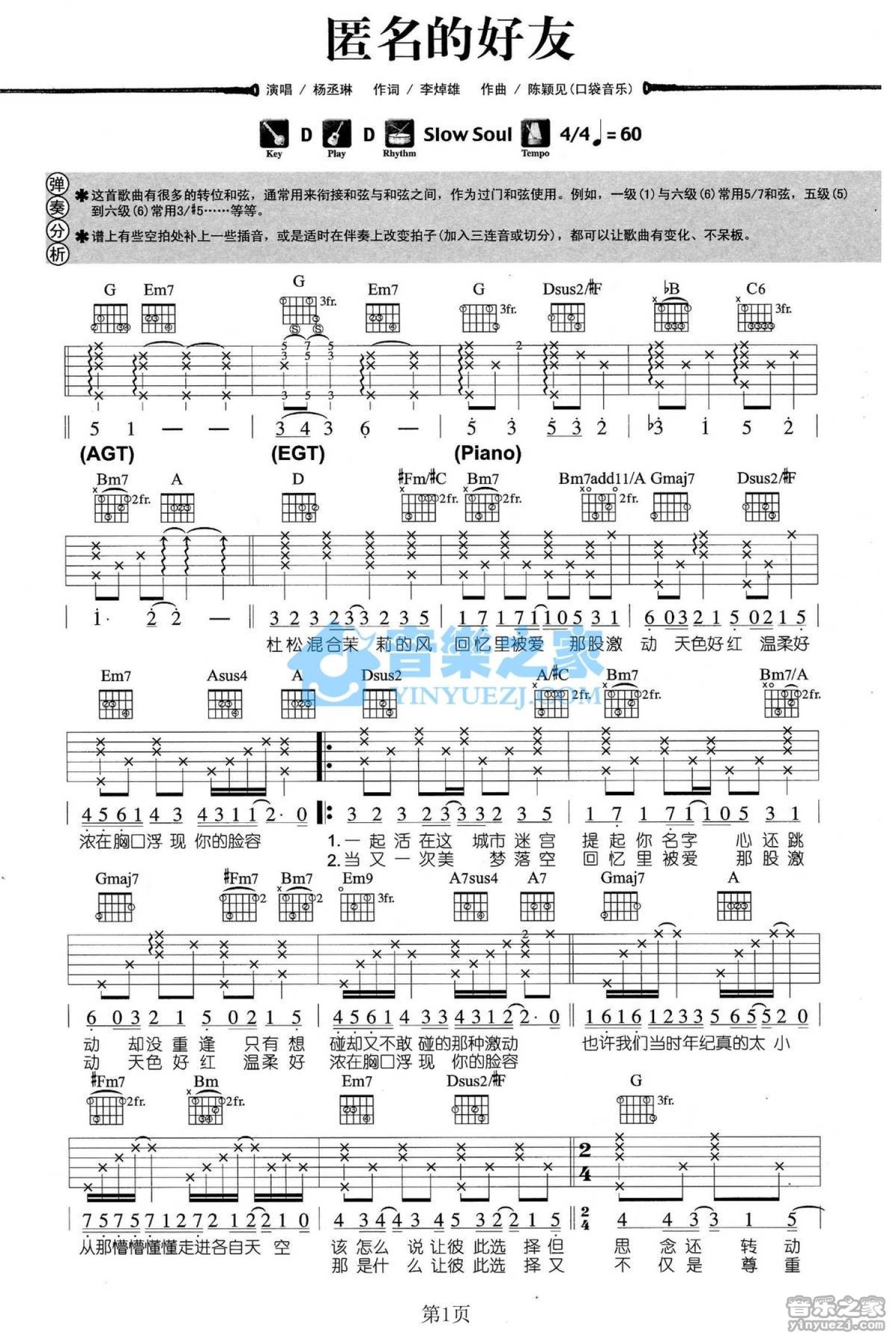 曲谱介绍: D调版《匿名的好友》吉他弹唱六线谱