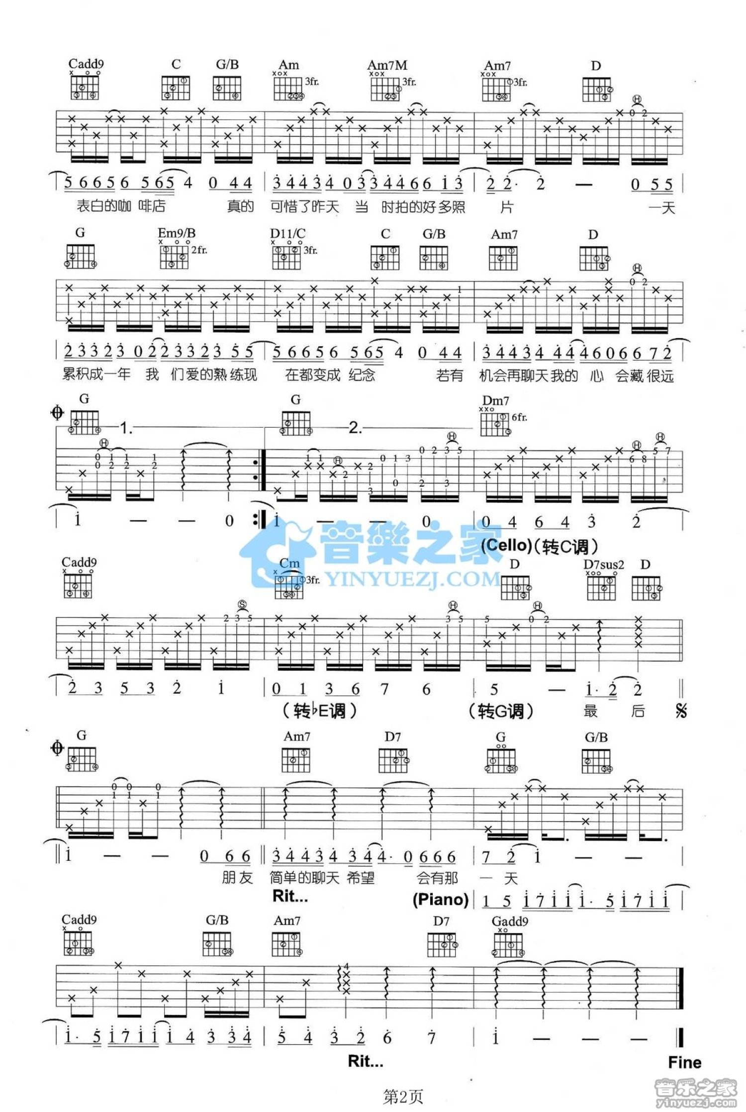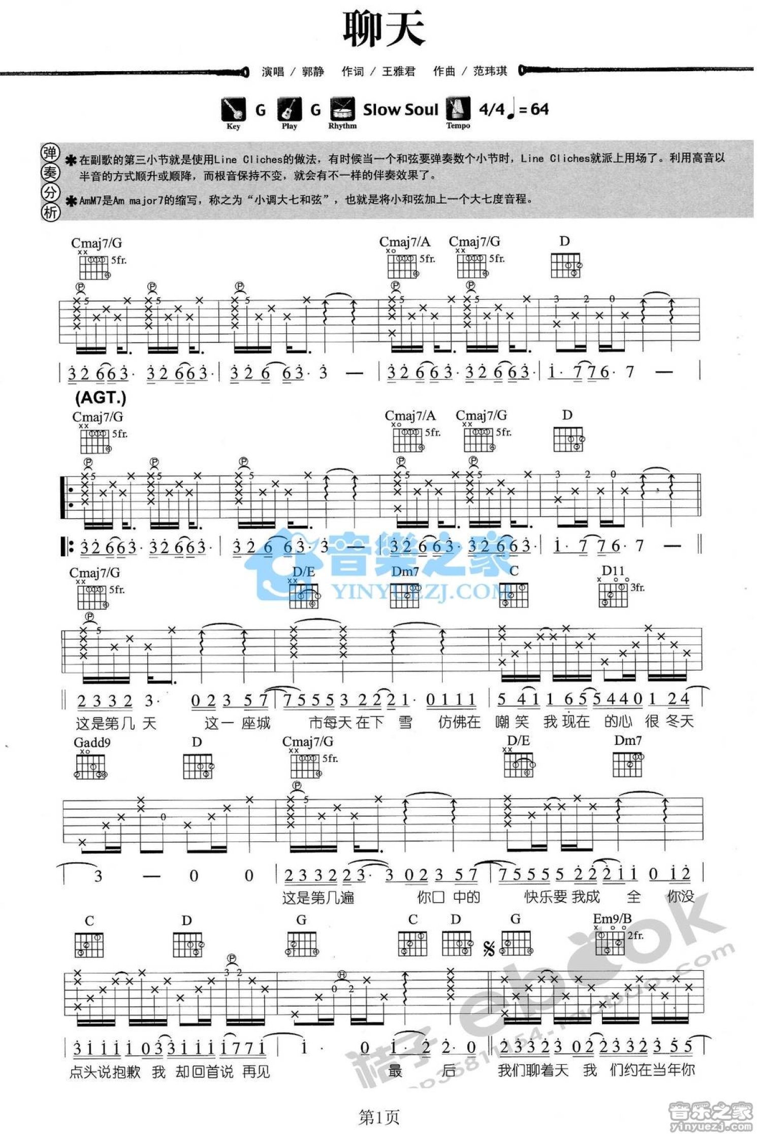 曲谱介绍: 卢家宏G调版 郭静《聊天》吉他弹唱六线谱