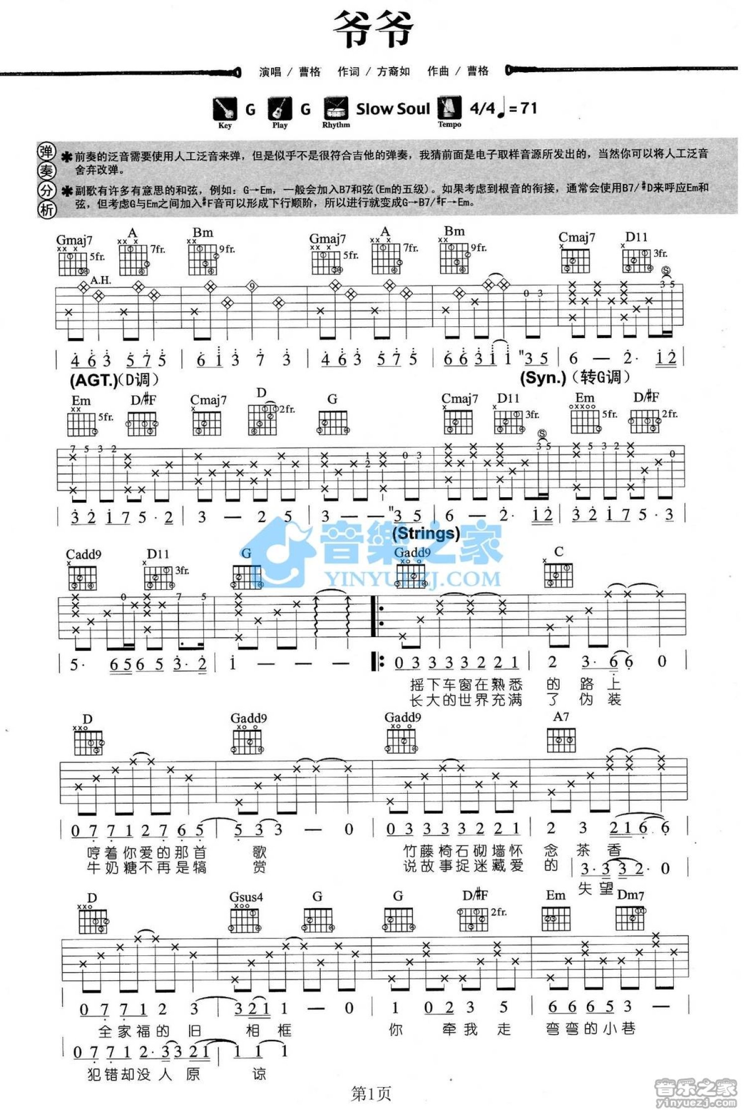 曲谱介绍: G调版 曹格《爷爷》吉他弹唱六线谱