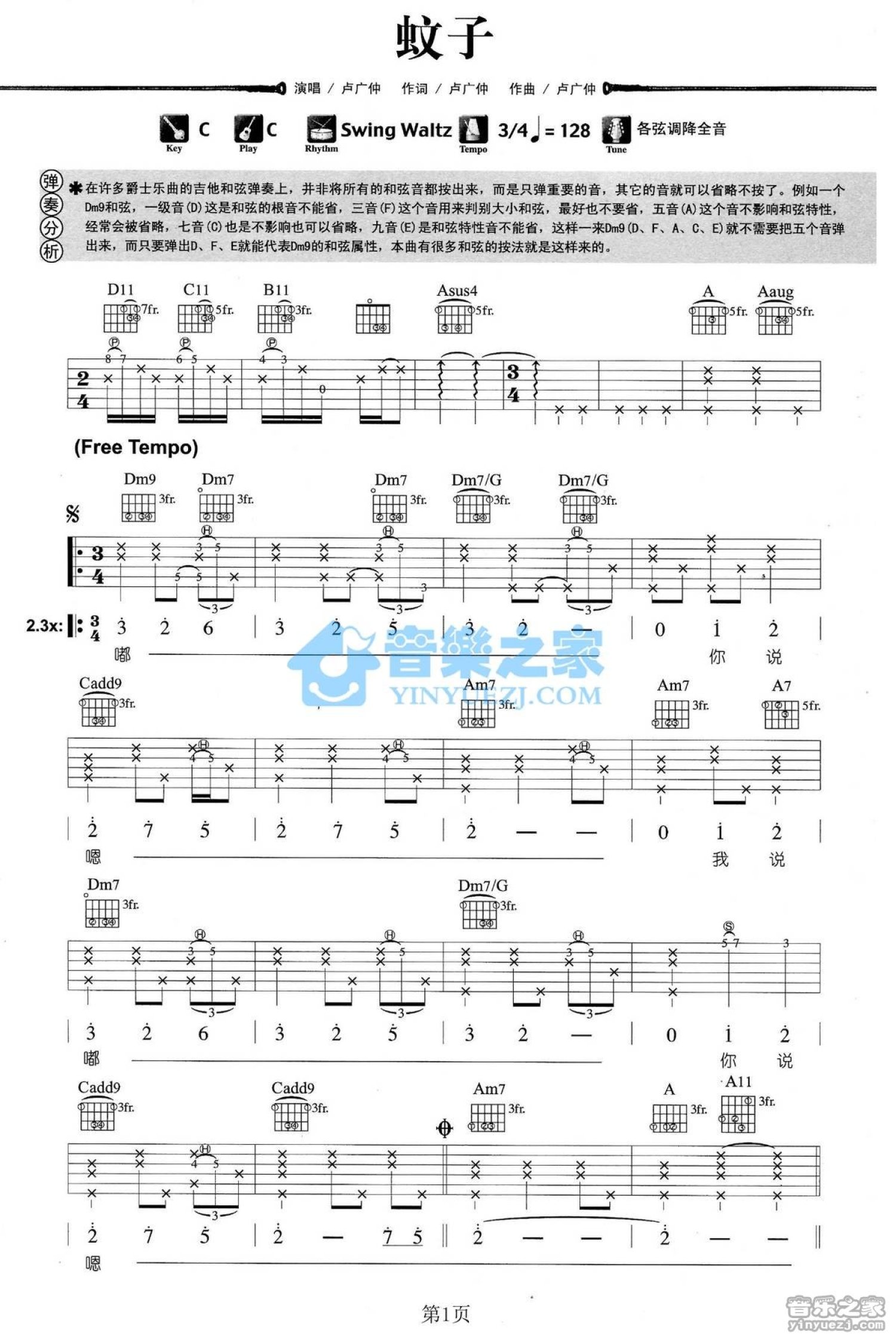 曲谱介绍: C调版 卢广仲《蚊子》吉他弹唱六线谱