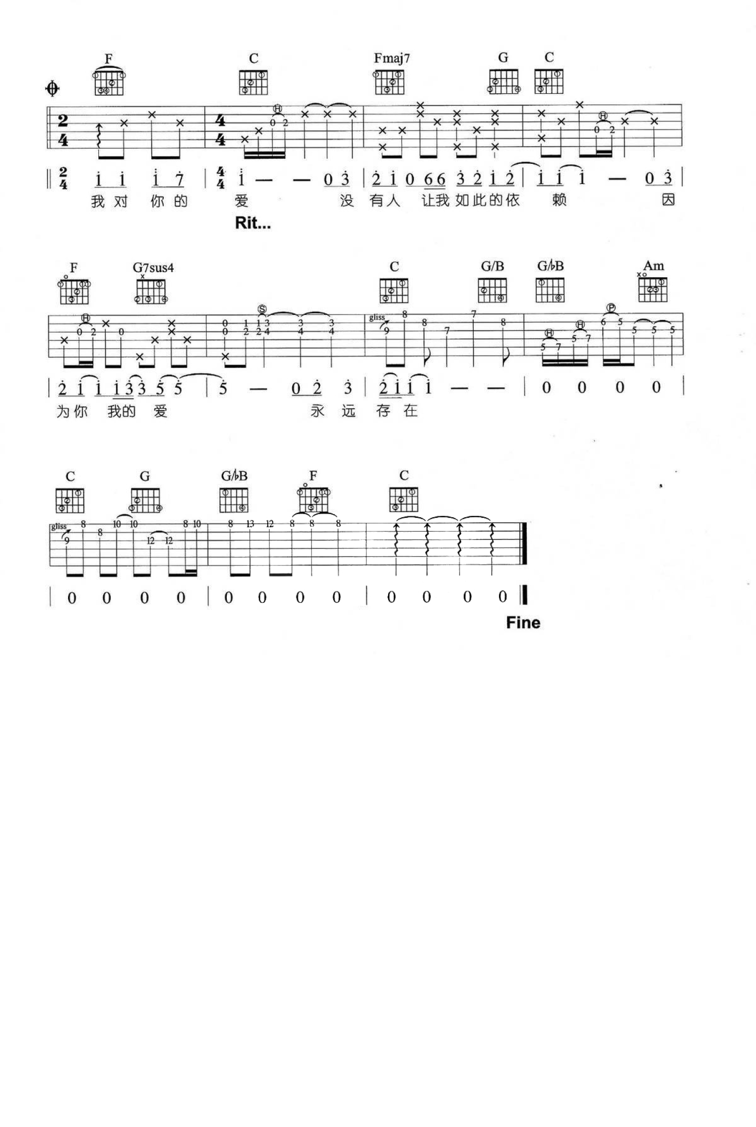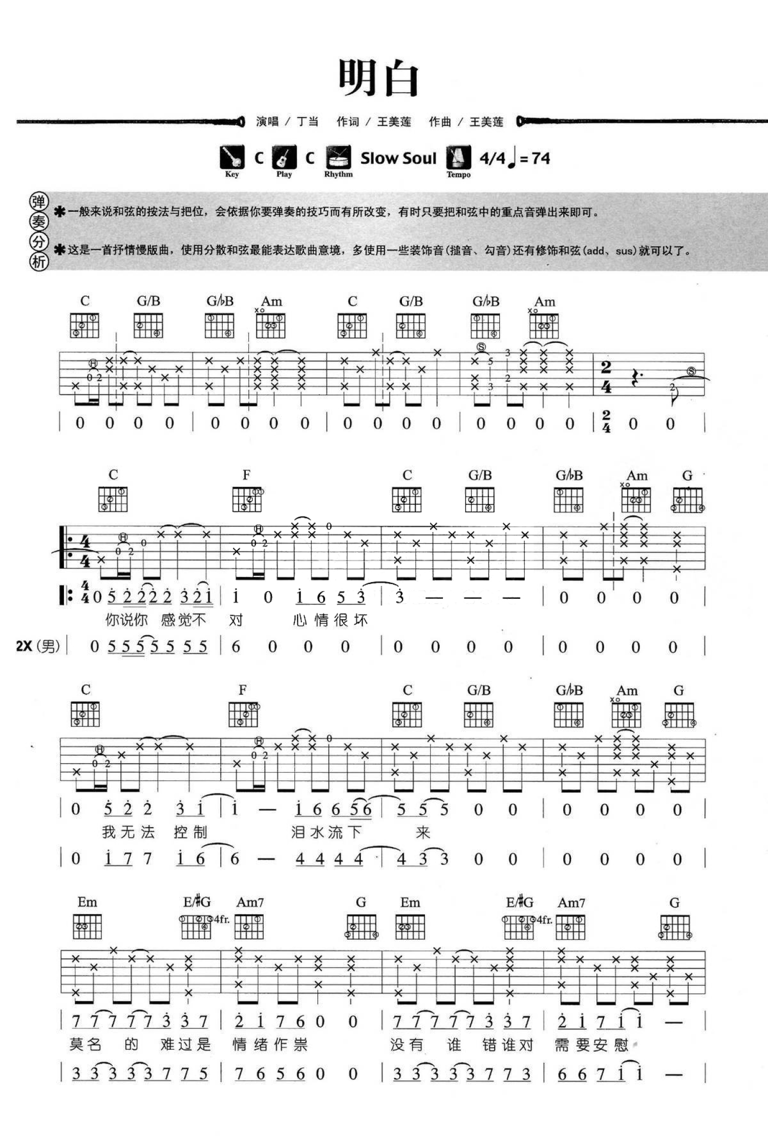 曲谱介绍: C调版 丁当《明白》吉他弹唱六线谱