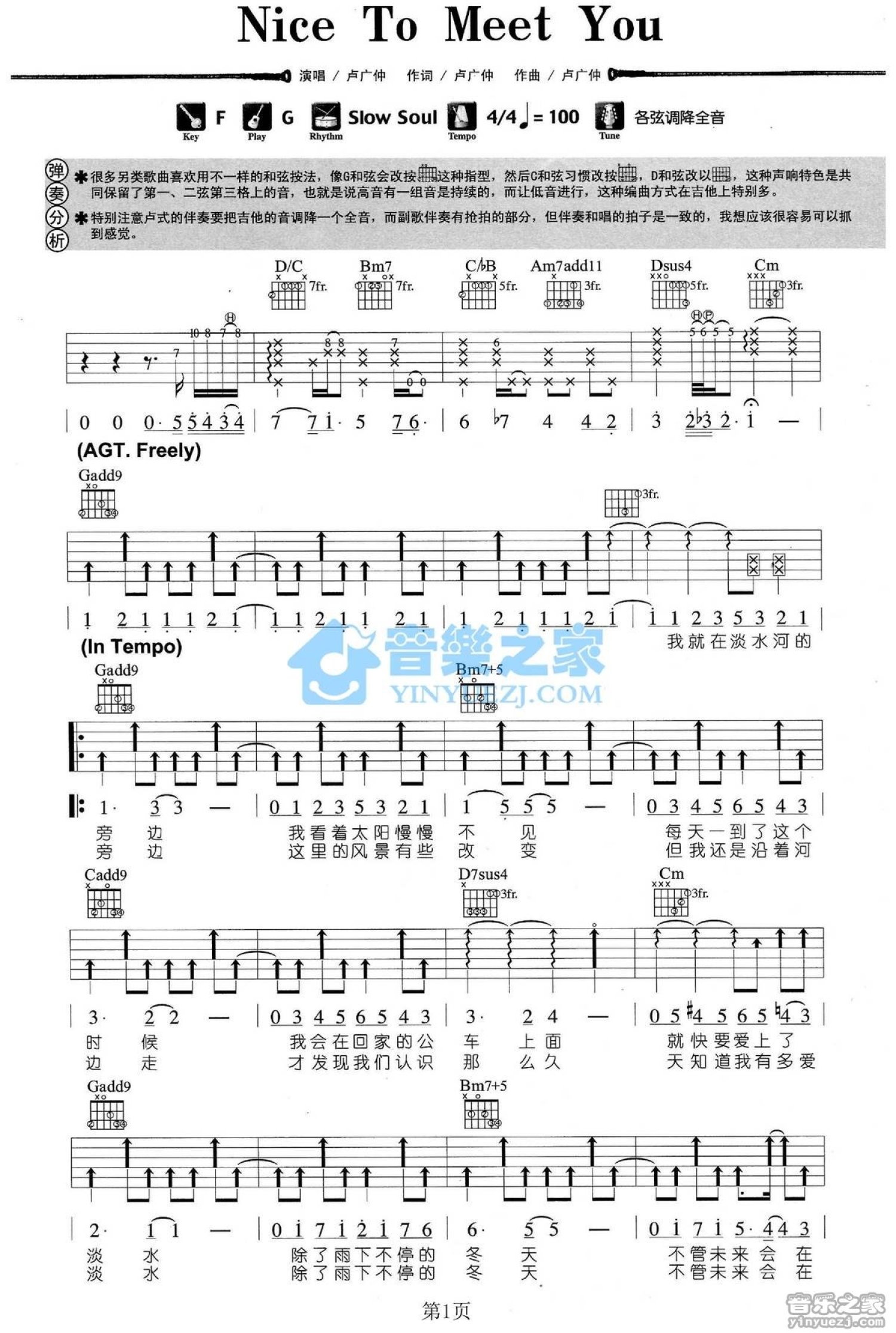 曲谱介绍: G调版 卢广仲《Nice To Meet You》吉他弹唱六线谱