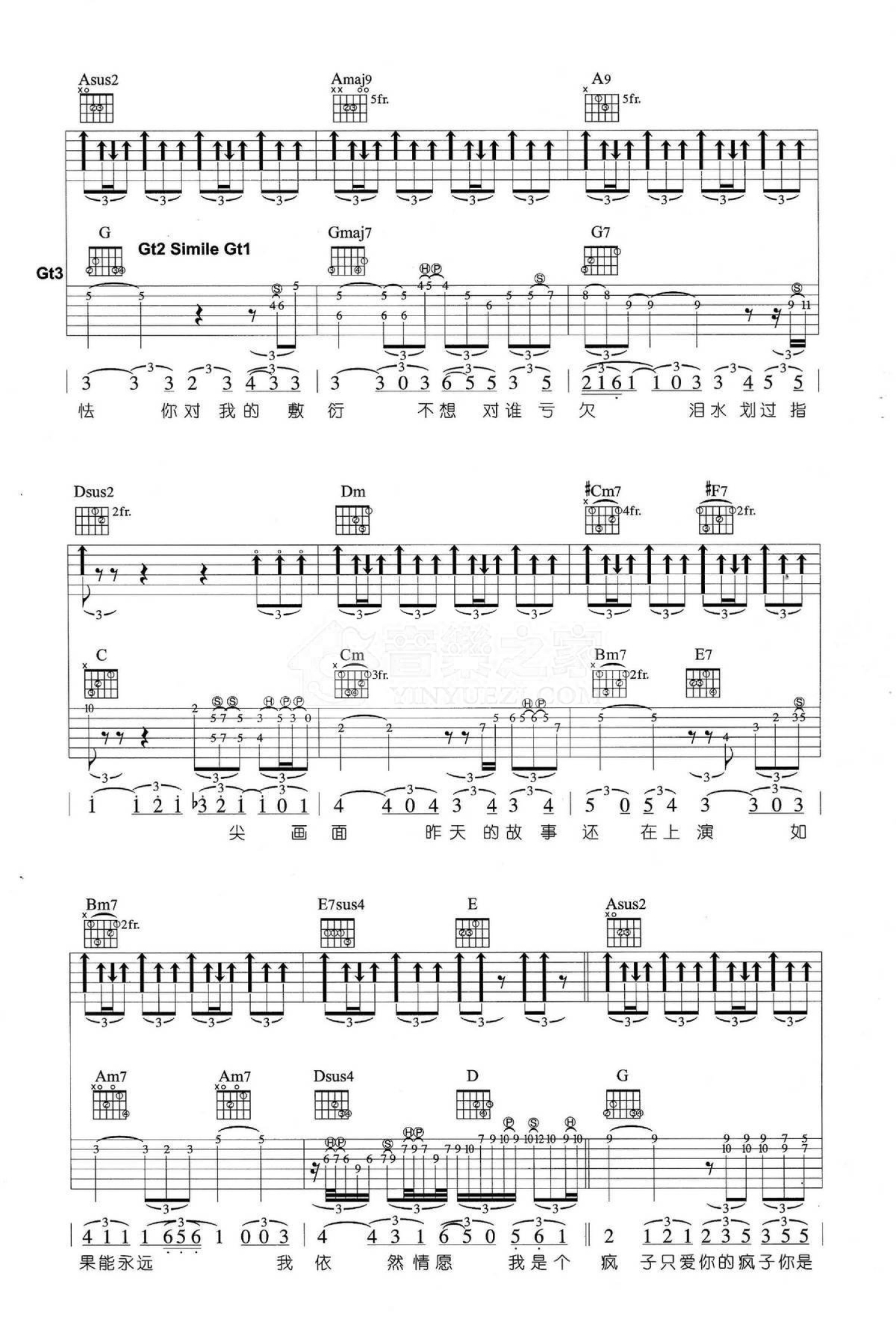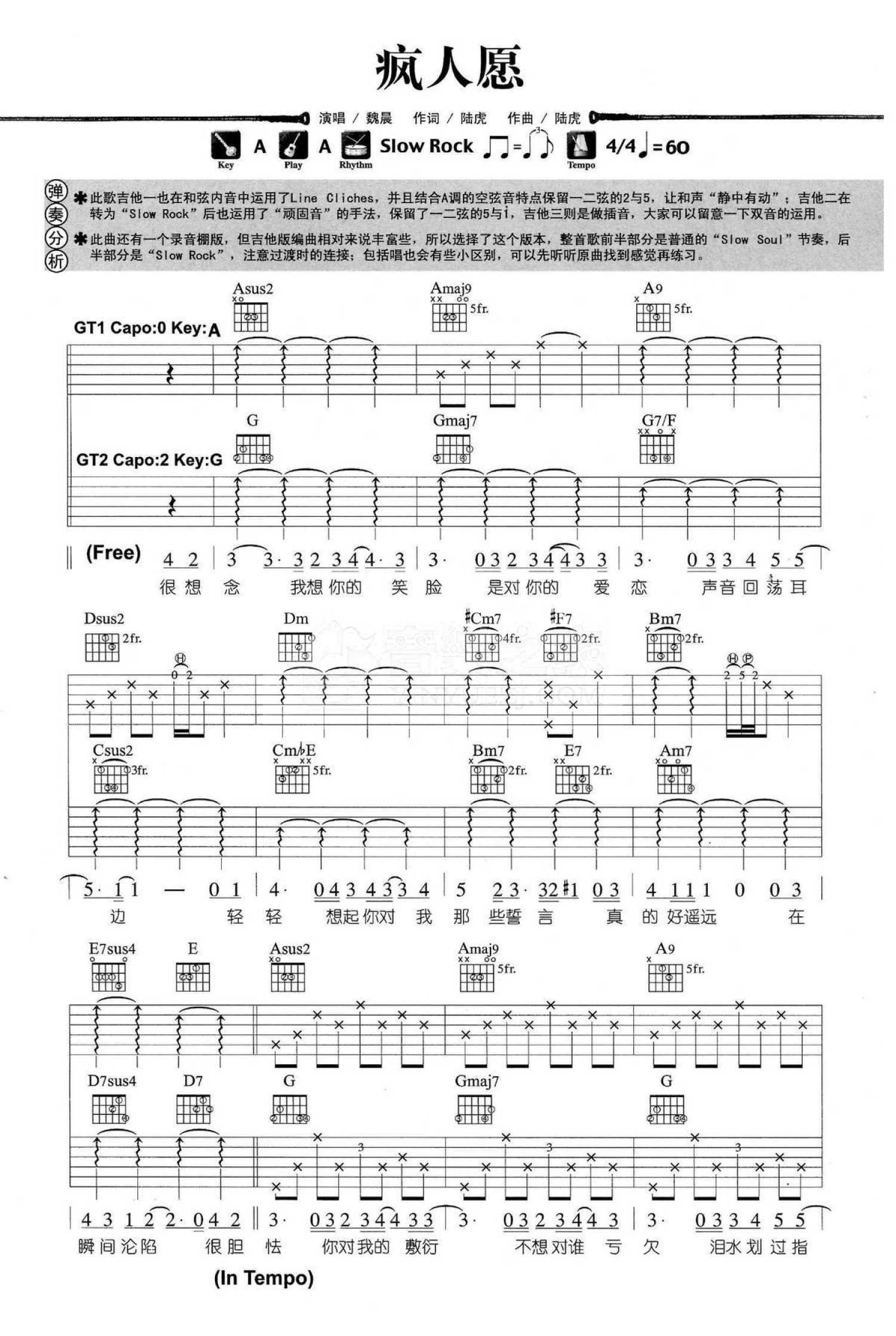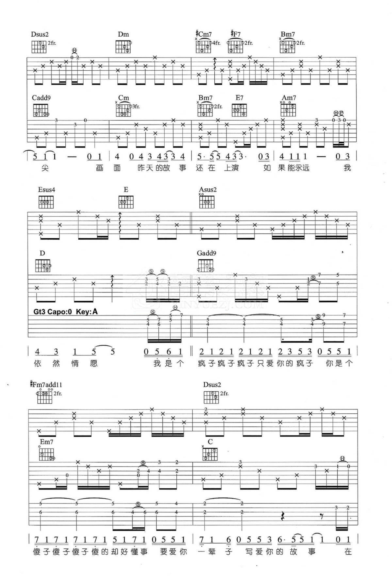 曲谱介绍: A调三吉他版 魏晨《疯人愿》吉他弹唱六线谱