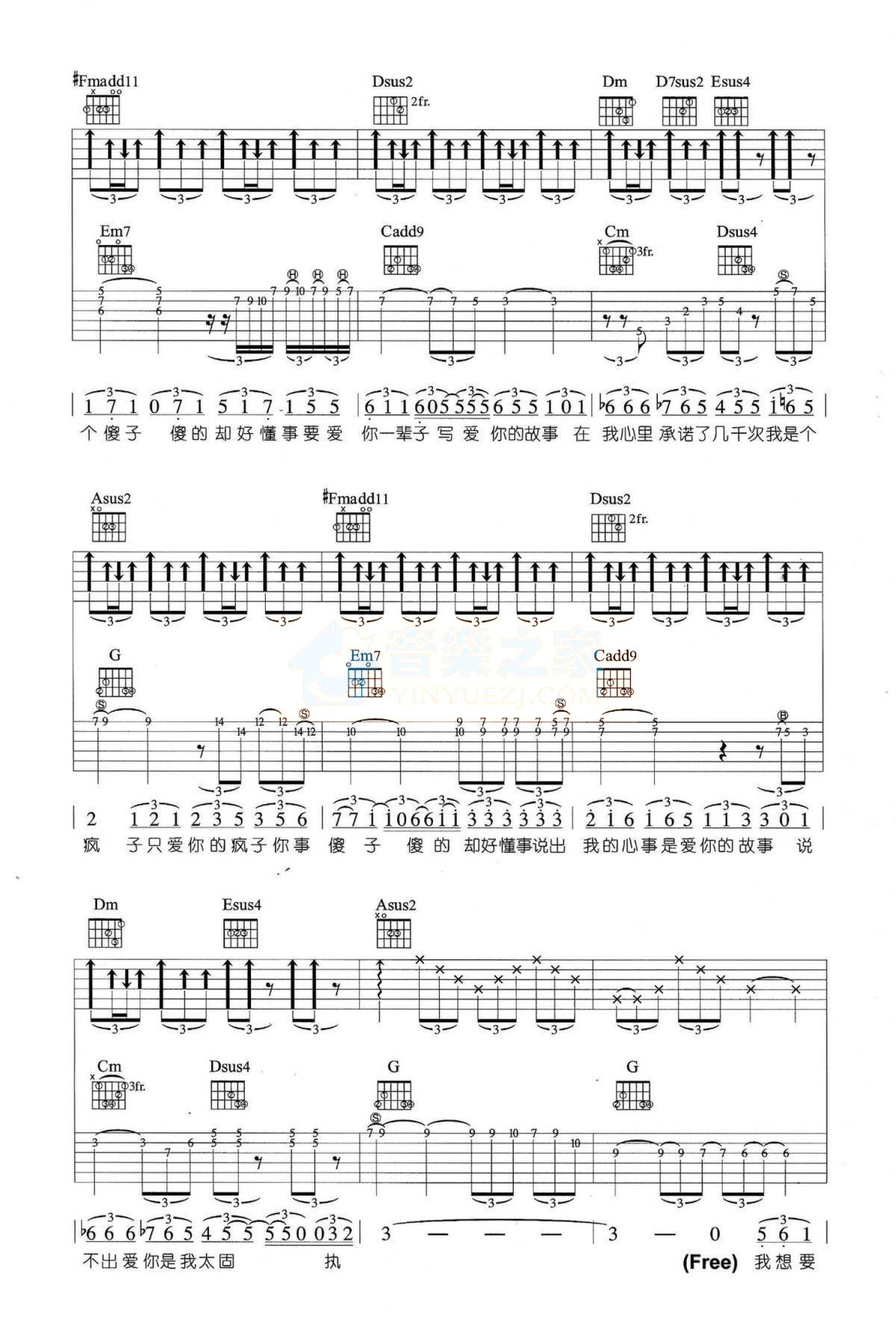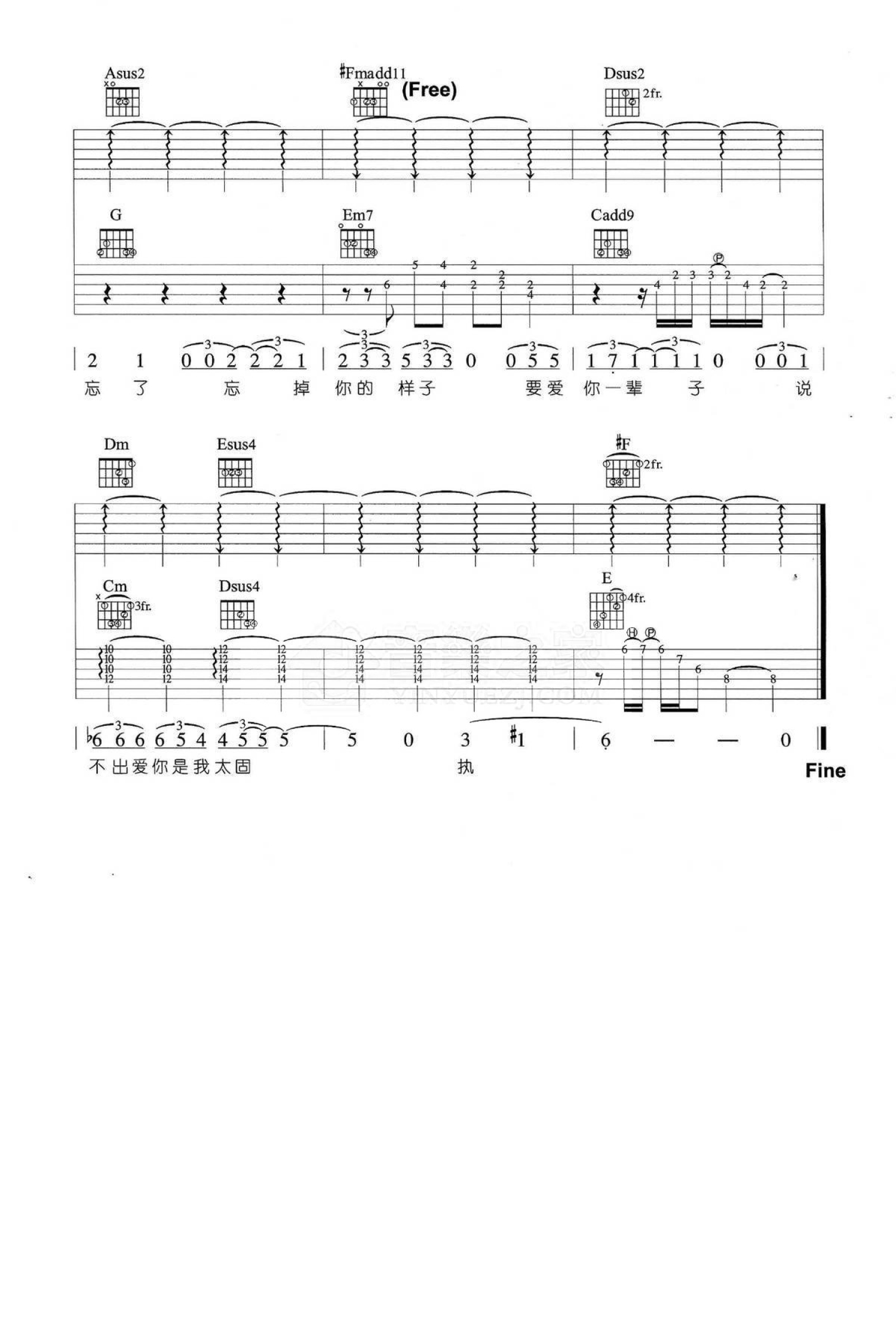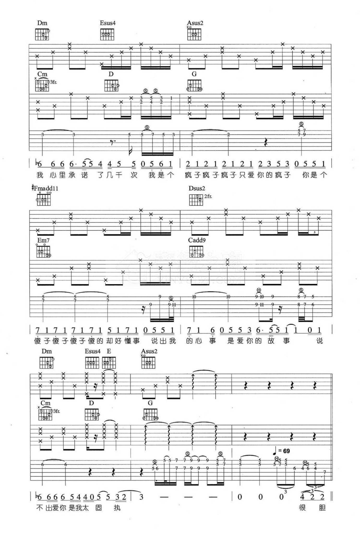 曲谱介绍: A调三吉他版 魏晨《疯人愿》吉他弹唱六线谱