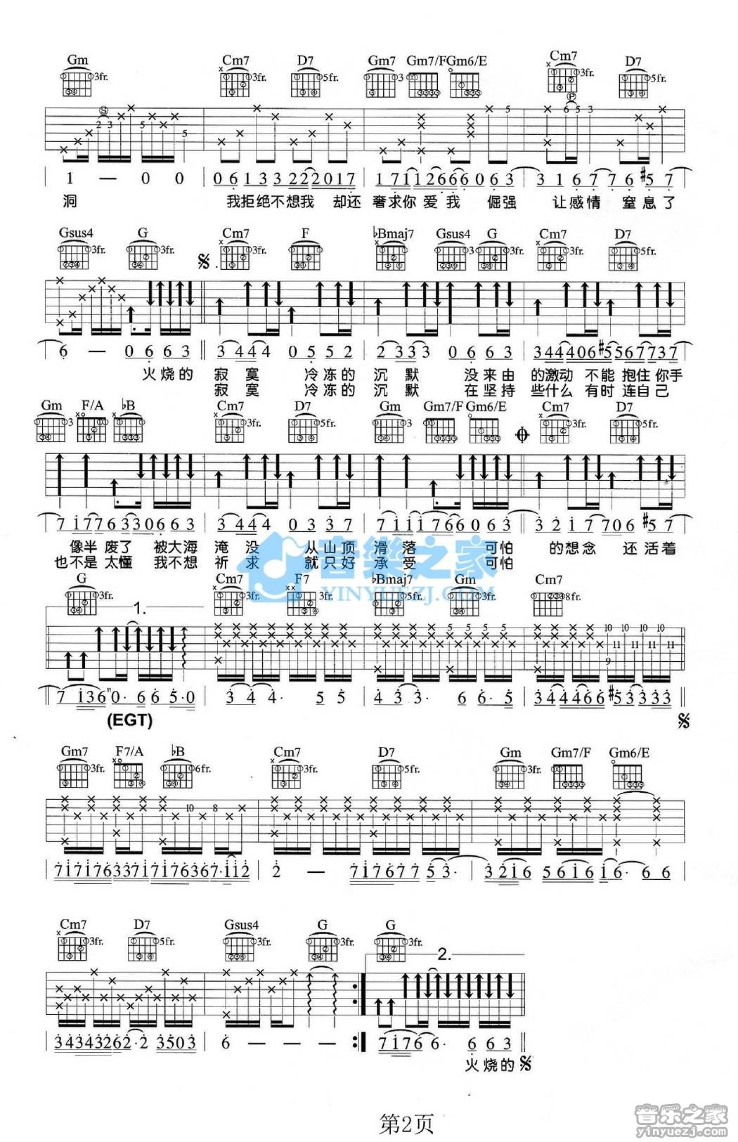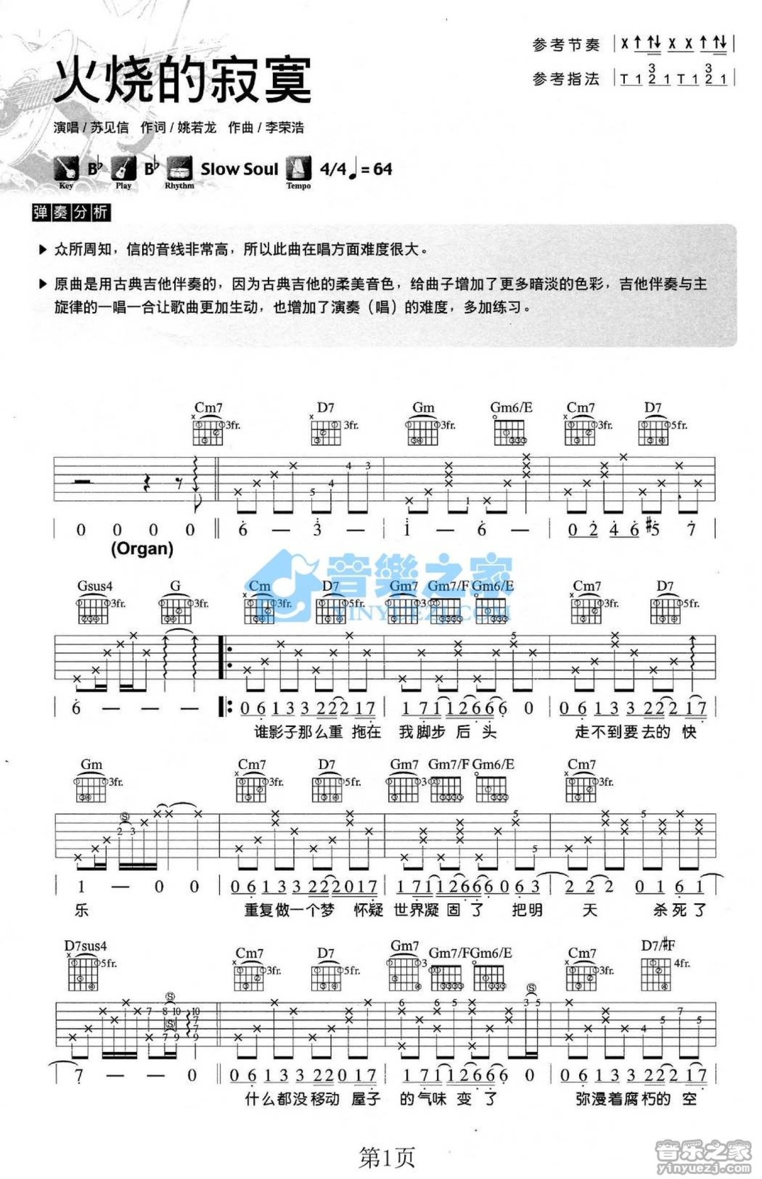 曲谱介绍: bB调版 苏见信《火烧的寂寞》吉他弹唱六线谱