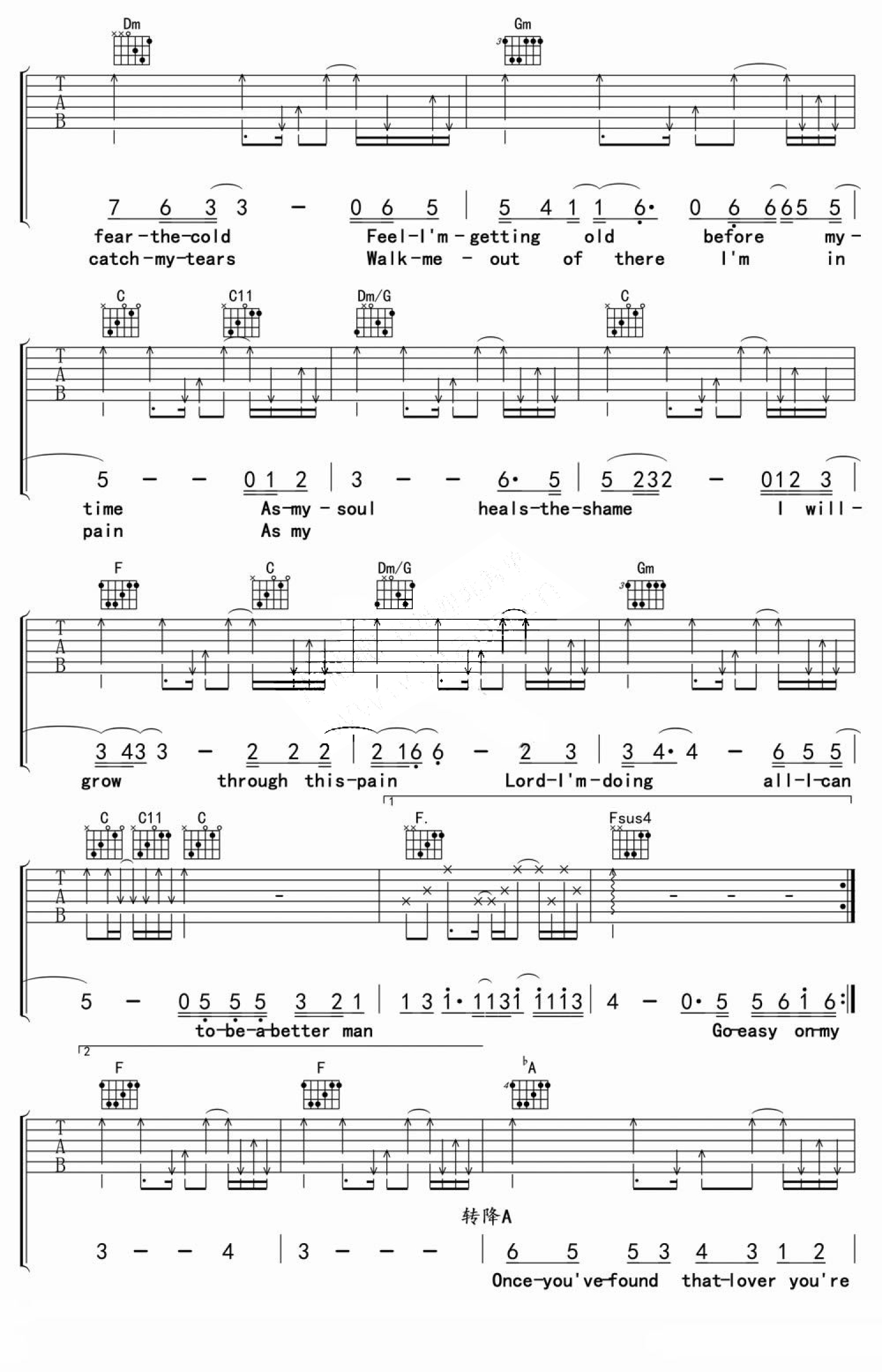 曲谱介绍: Robbie Williams Better Man吉他六线谱,F调转降A,高清图片谱,罗比·威廉姆斯一首经典英文歌曲《成为更好的人》吉他谱,你是否曾经想过为了她要成为一个更出色的Better Man。你是否在为了拥有更厚实的肩膀去承担责任而努力成为Better Man。歌曲的歌词将对爱人的爱及对未来的承诺表达的淋漓尽致。句句深情,吉他天下网站推荐英文金曲推荐,“ Im doing all I can to be a better man”,我们都在努力成为更好的人。