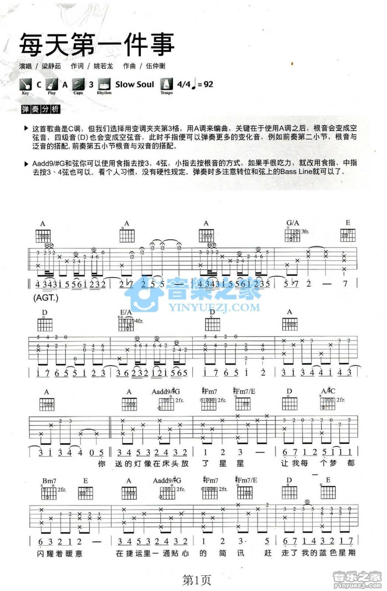 曲谱介绍: 卢家宏A调版 梁静茹《每天第一件事》吉他弹唱六线谱