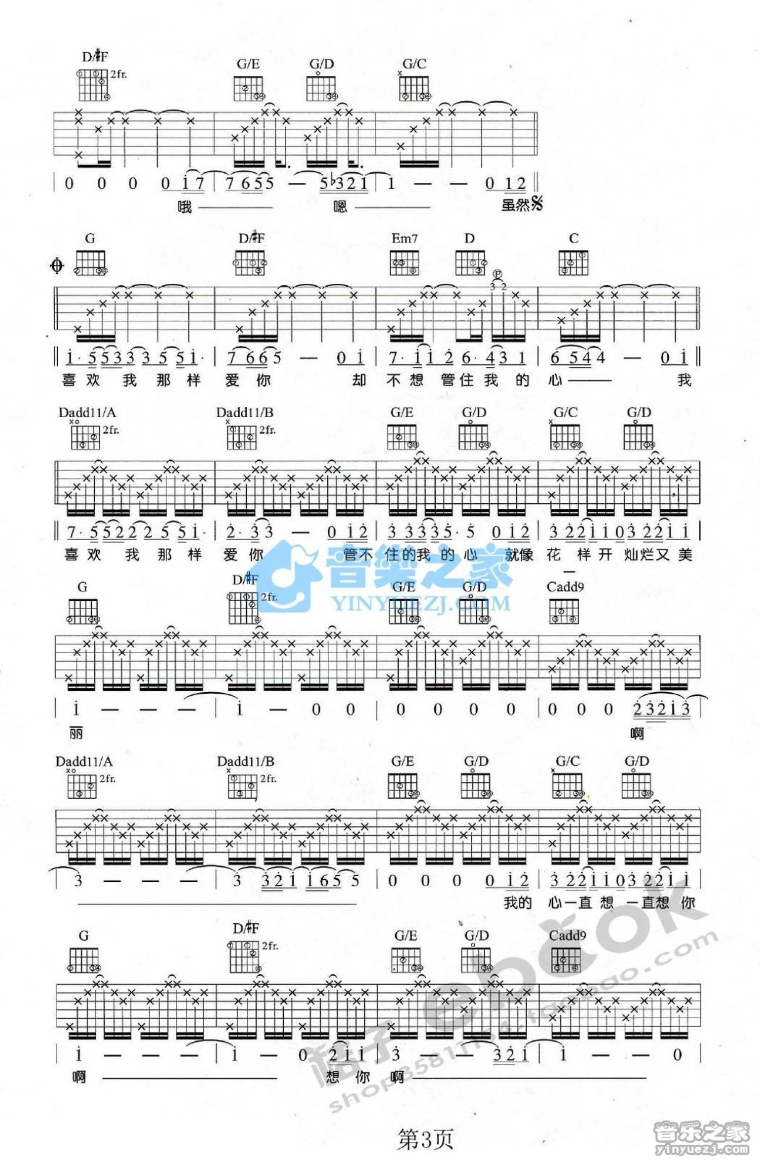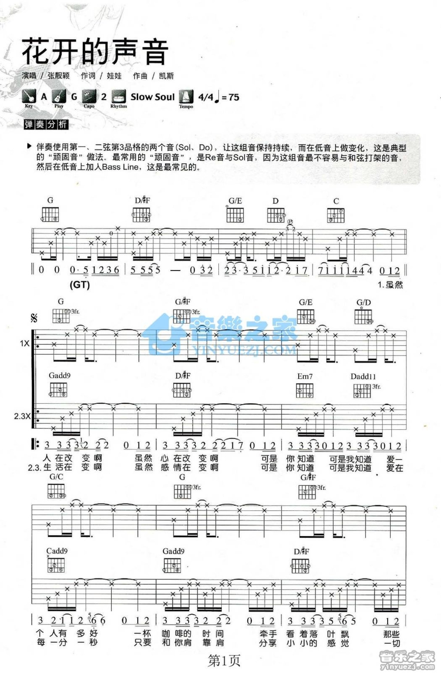 曲谱介绍: G调版《花开的声音》吉他弹唱六线谱