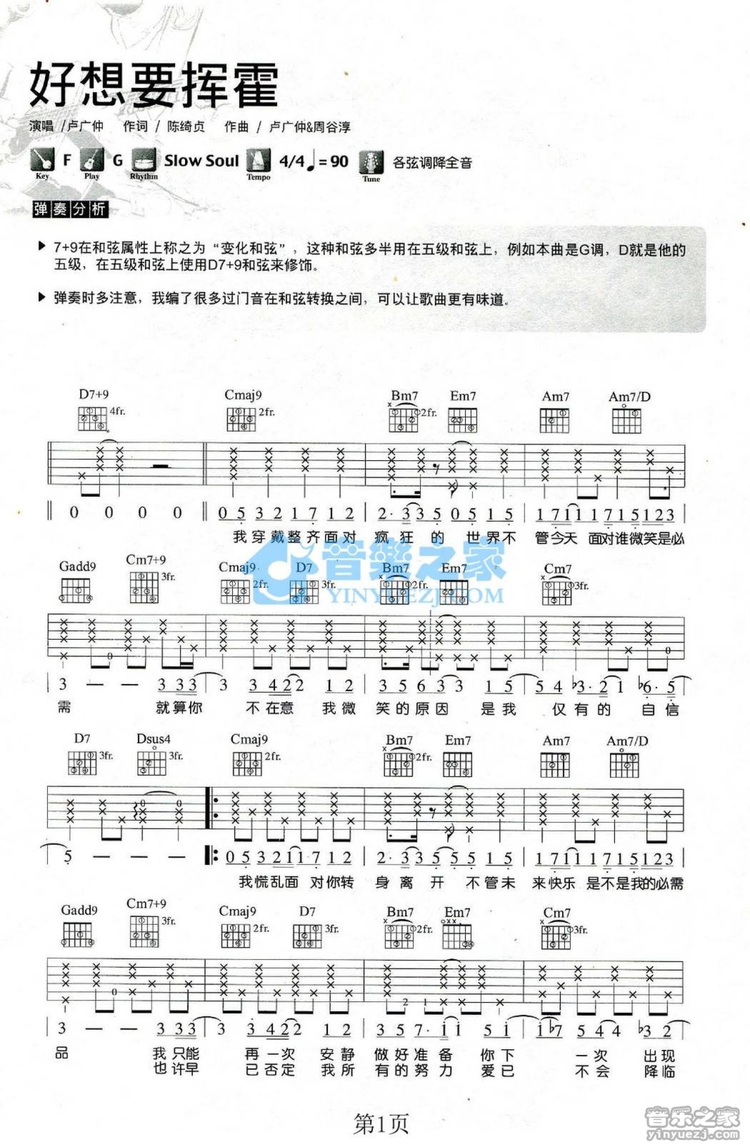 曲谱介绍: G调版 卢广仲《好像要挥霍》吉他弹唱六线谱