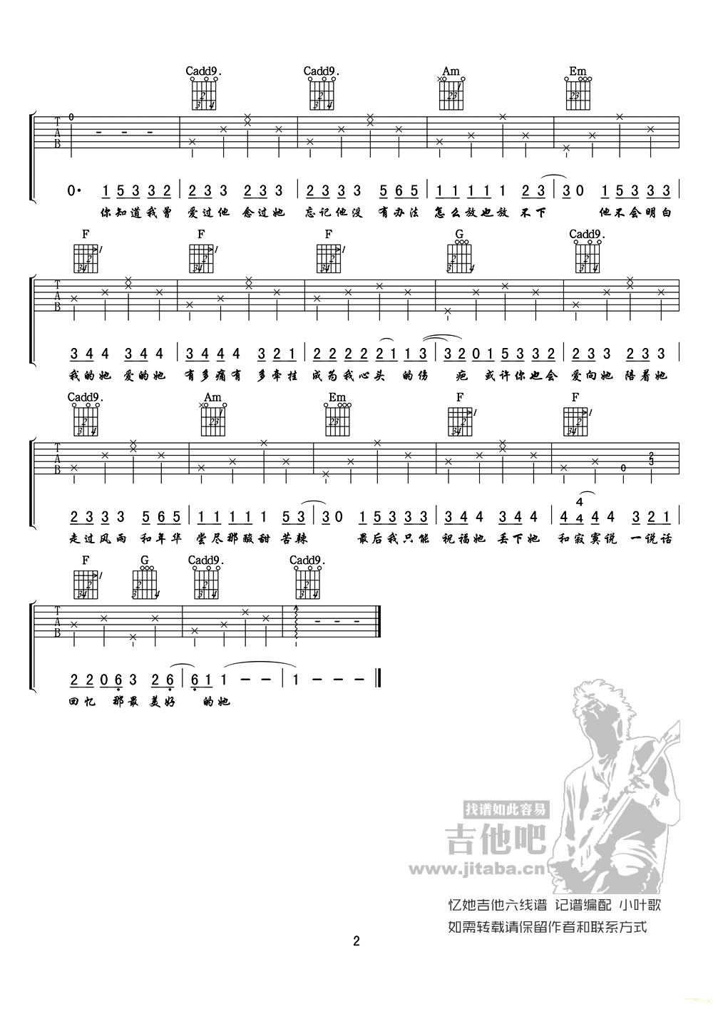 曲谱介绍: 忆她吉他六线谱,C调指法编配,赵烁演唱的《忆她》吉他谱完整版,淡淡安静的旋律,简单好弹好唱。每个人都有那么一段懵懵懂懂的情感,不管最后如何,那依旧是青春里一道绚丽的光彩,忆她吉他弹唱谱,歌曲让人想起了自己曾痴痴守候的他,那种孤独喜悲只有经历了才懂。