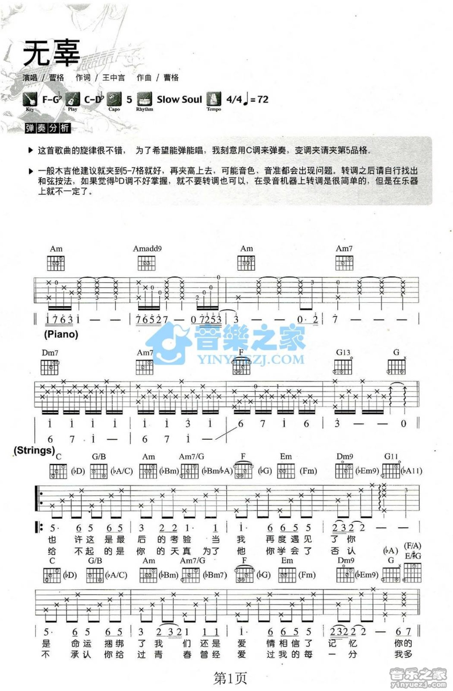 曲谱介绍: C转bD调版 曹格《无辜》吉他弹唱六线谱