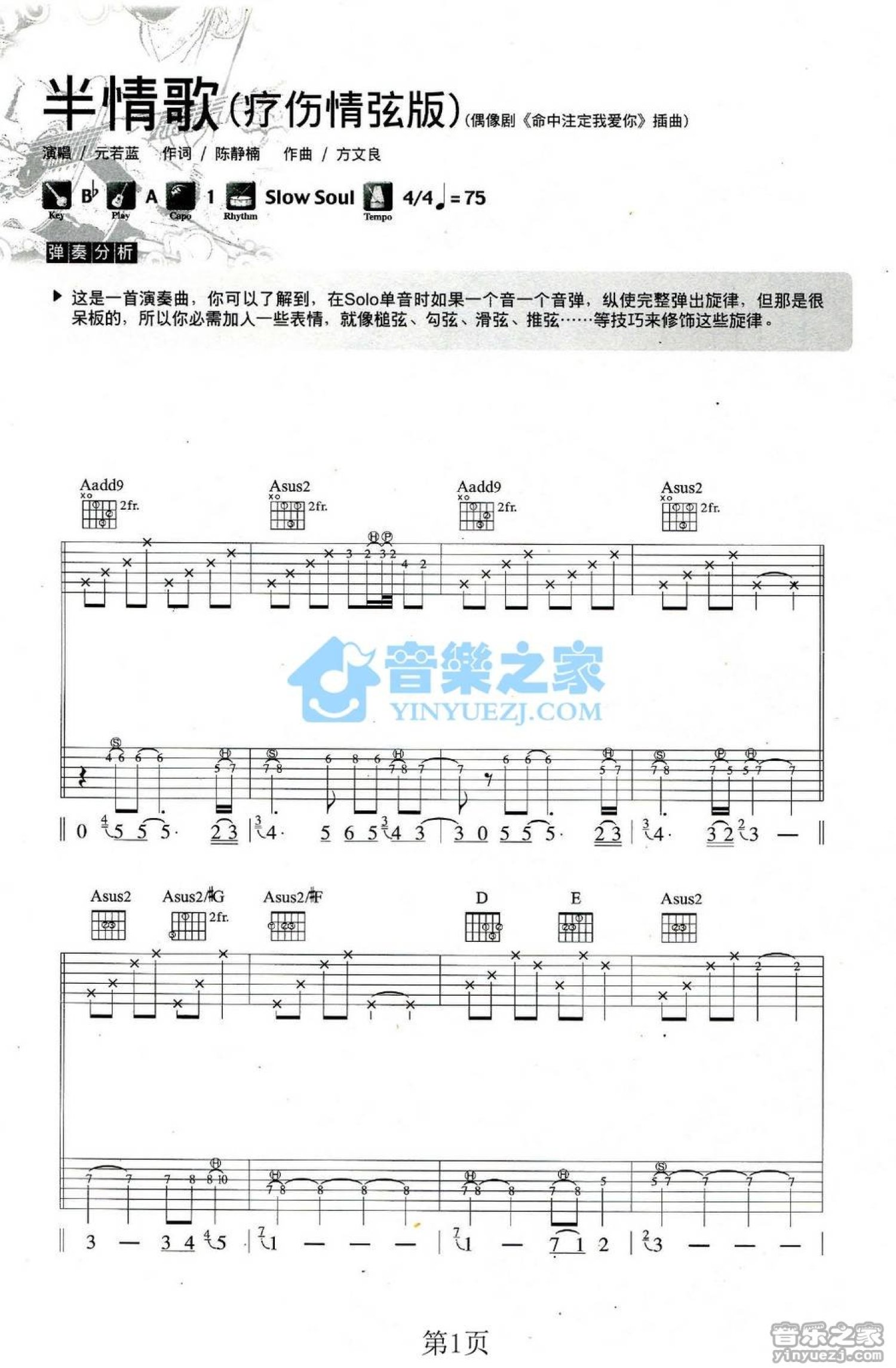 曲谱介绍: A调疗伤情弦版《半情歌》吉他弹唱六线谱