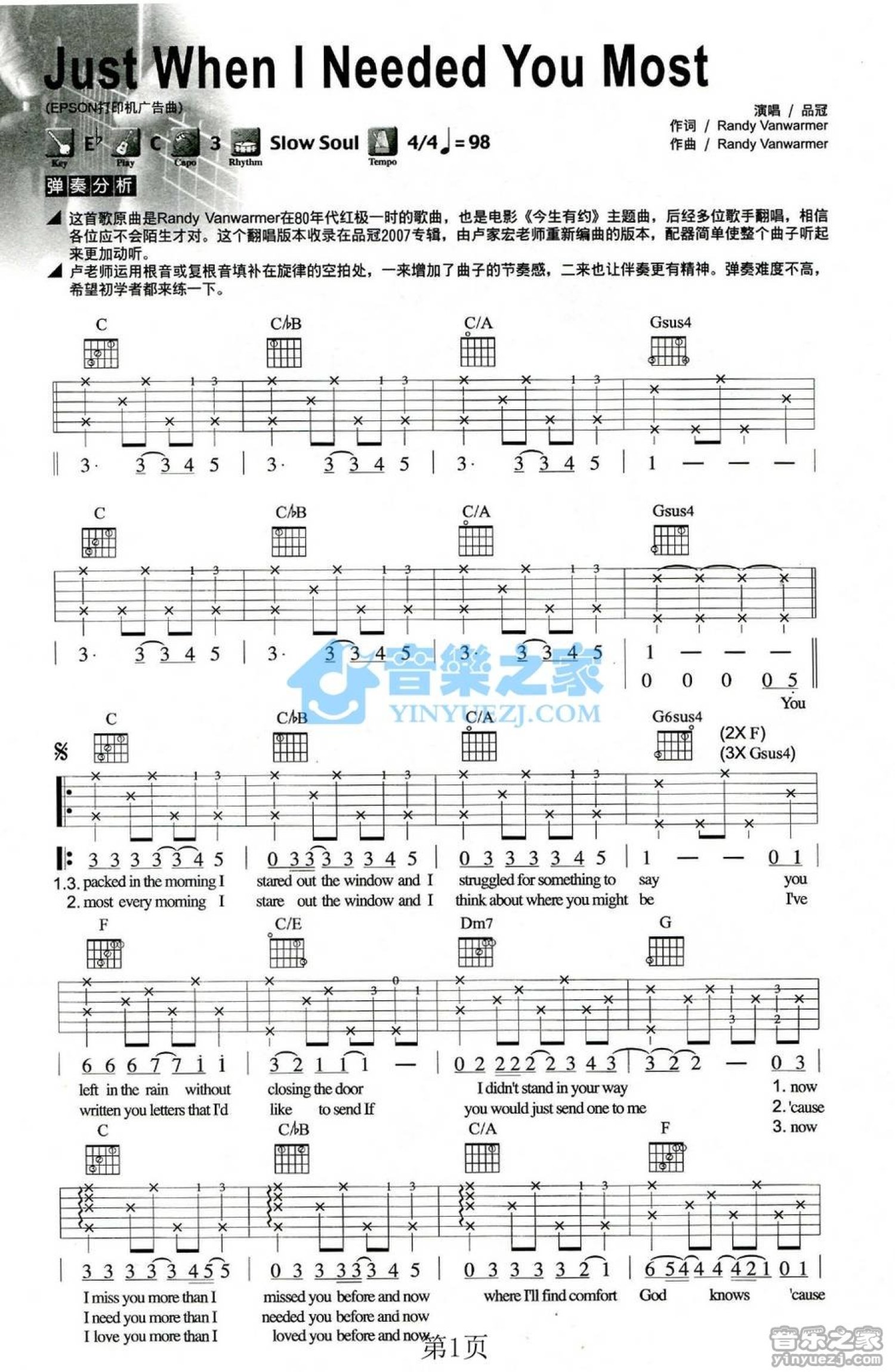 曲谱介绍: C调版 品冠《Just When I Needed You Most》吉他弹唱六线谱