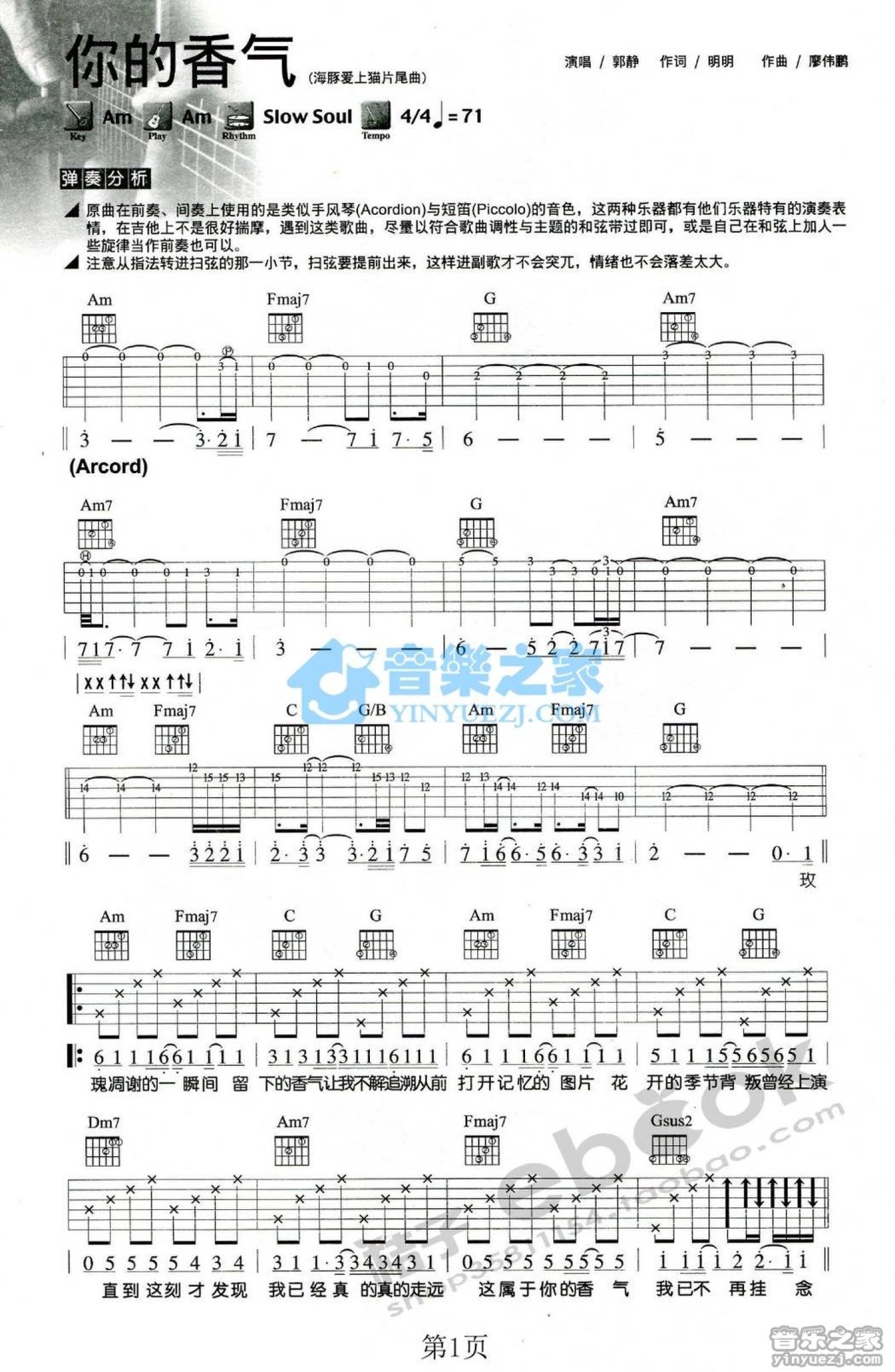 曲谱介绍: Am调版 郭静《你的香气》吉他弹唱六线谱