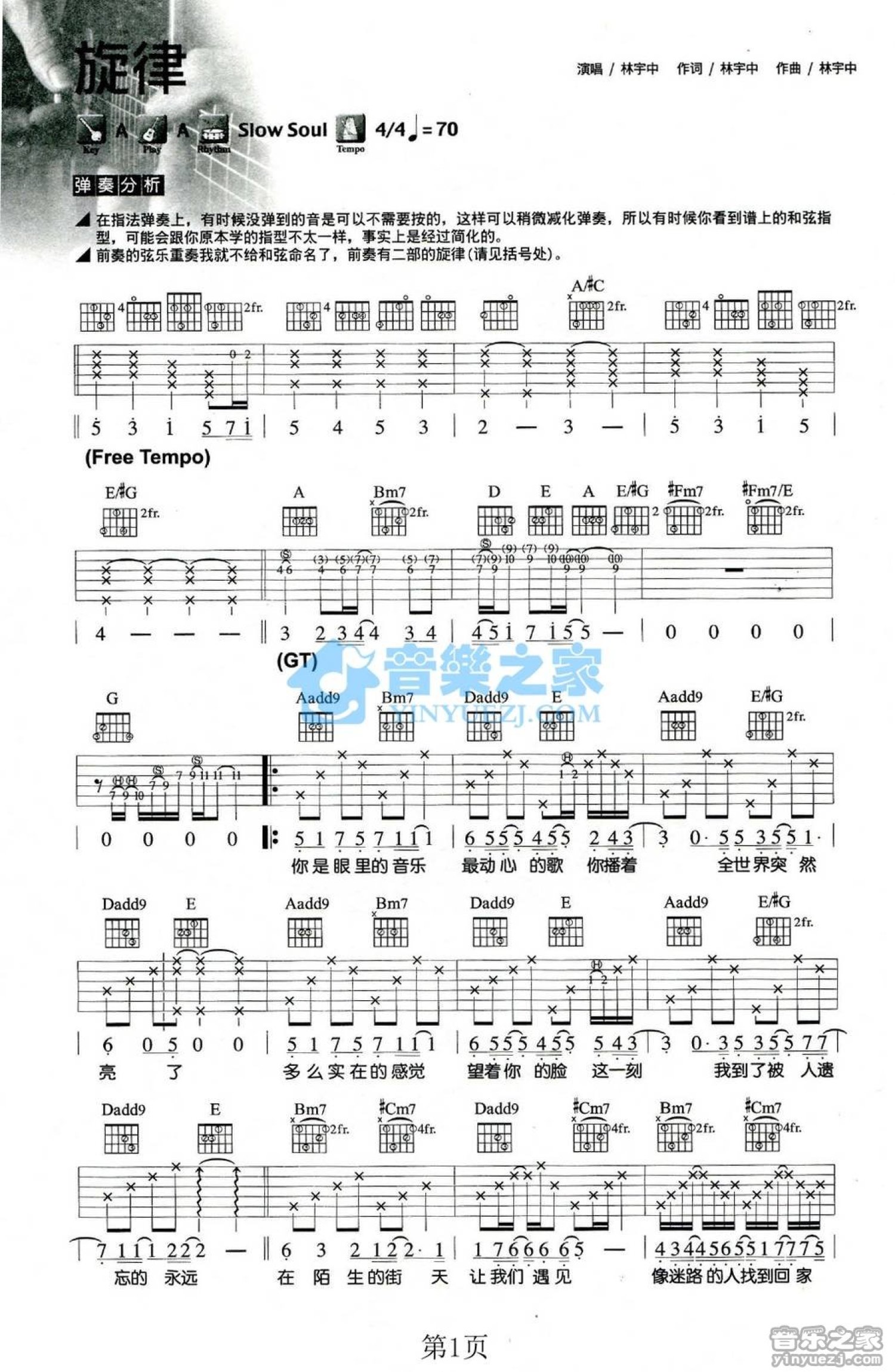 曲谱介绍: A调版 林宇中《旋律》吉他弹唱六线谱