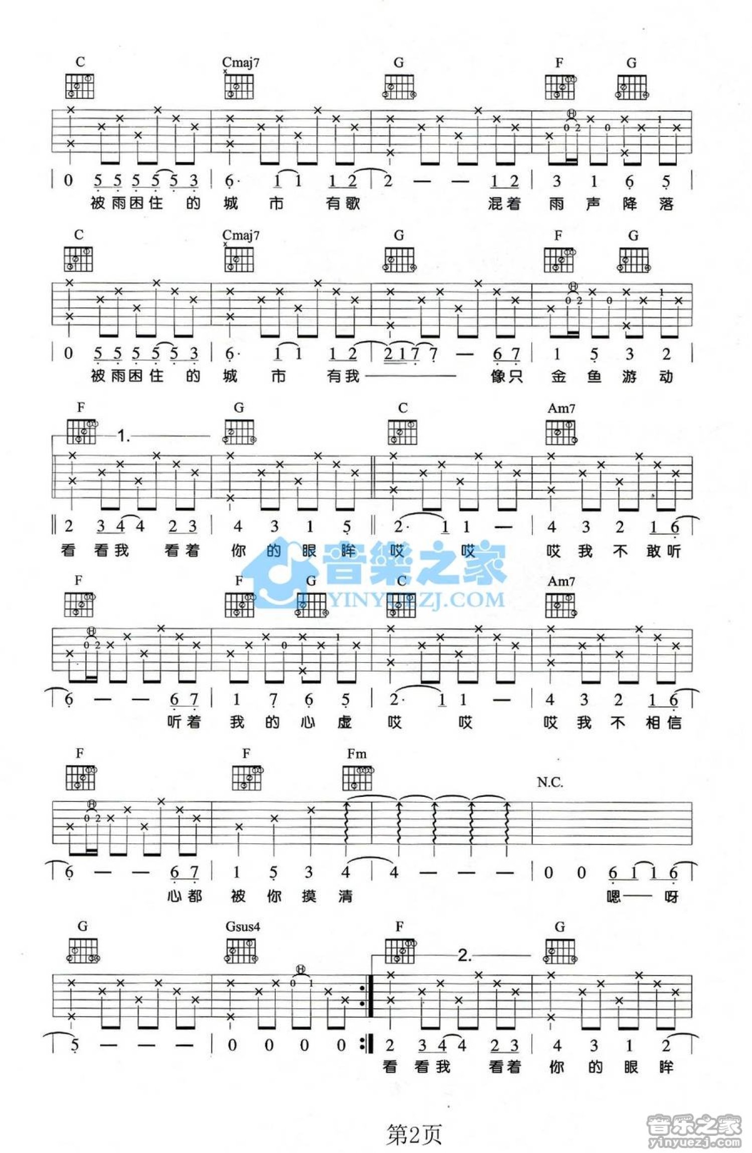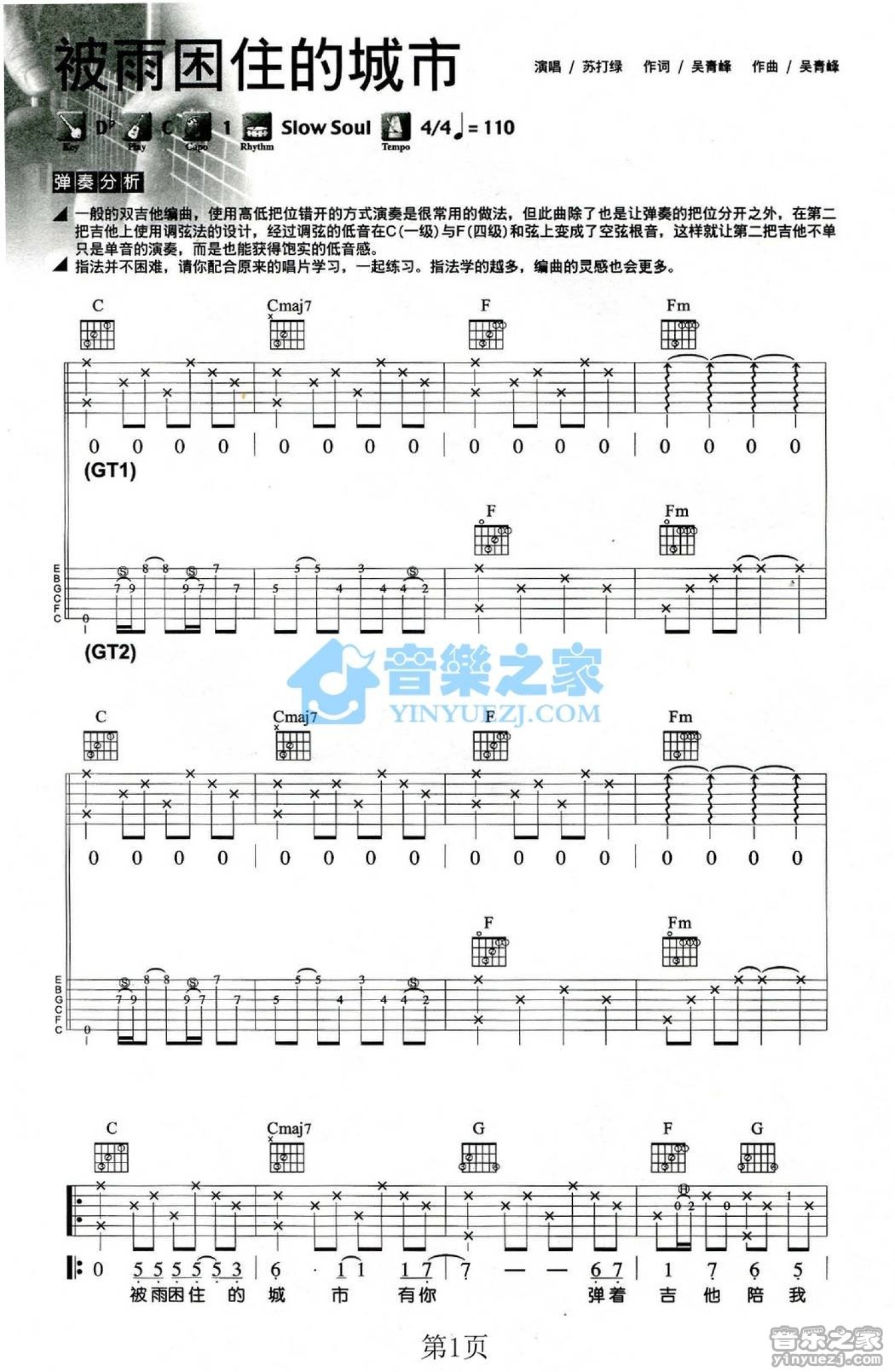 曲谱介绍: C调《被雨困住的城市》吉他弹唱六线谱