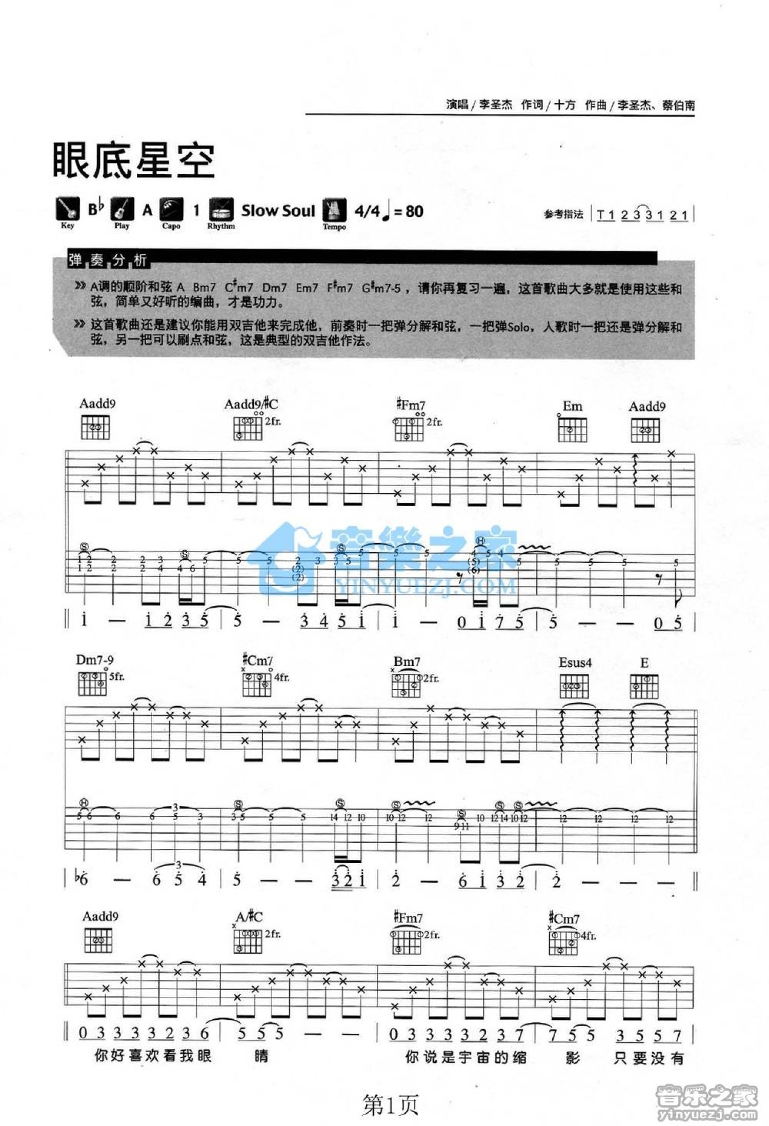 曲谱介绍: A调双吉他版 李圣杰《眼底星空》吉他弹唱六线谱