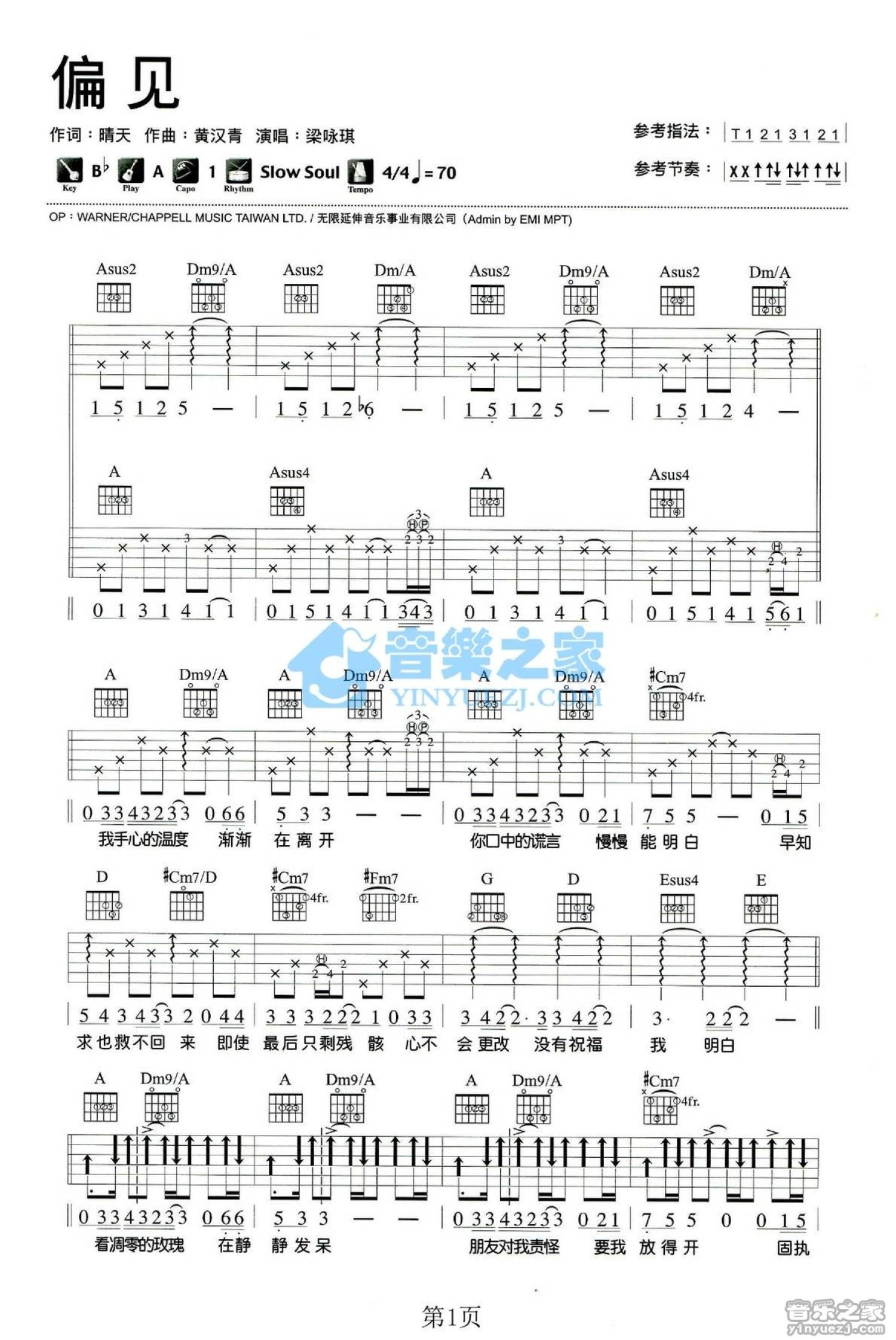 曲谱介绍: A调双吉他版 梁咏琪《偏见》吉他弹唱六线谱