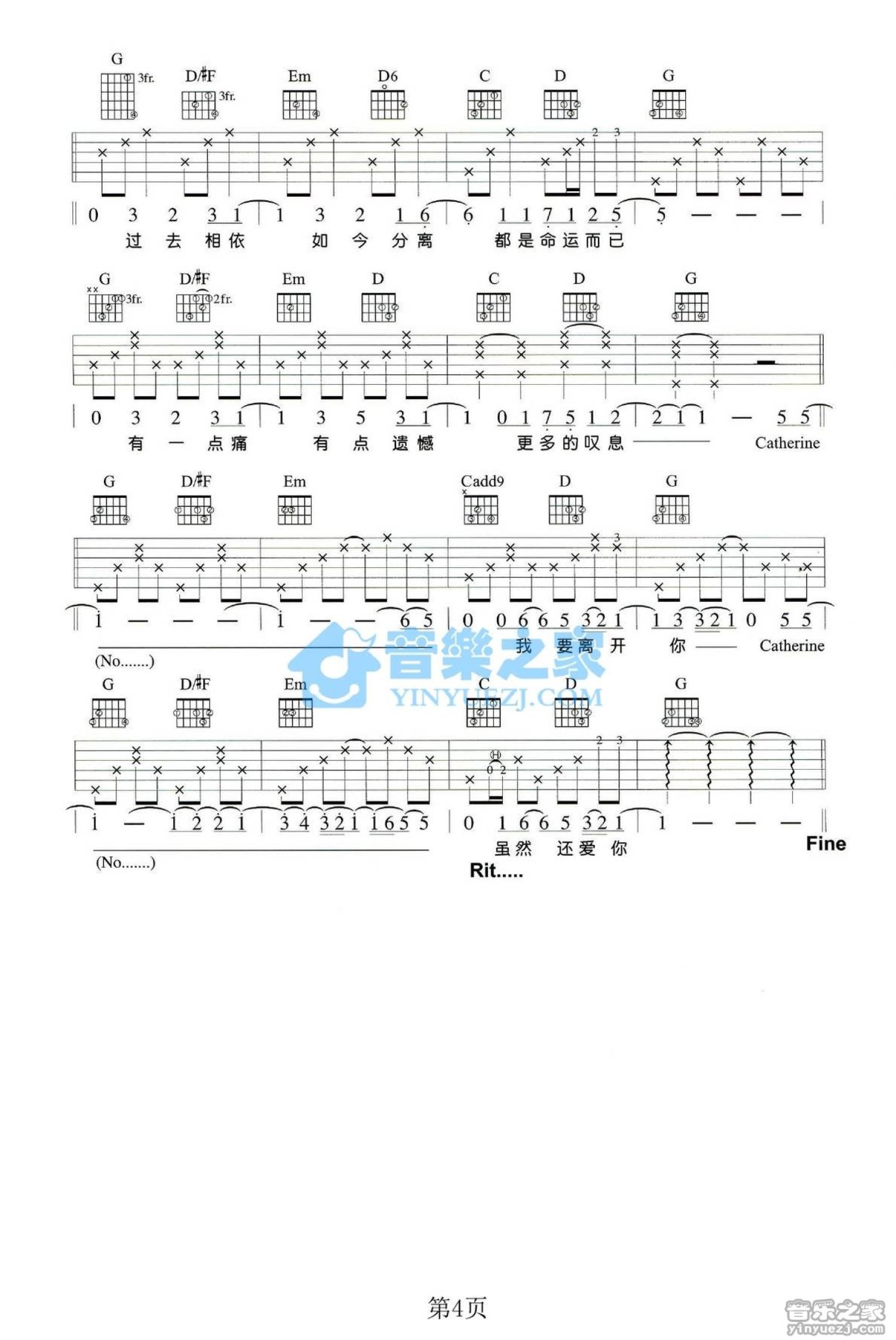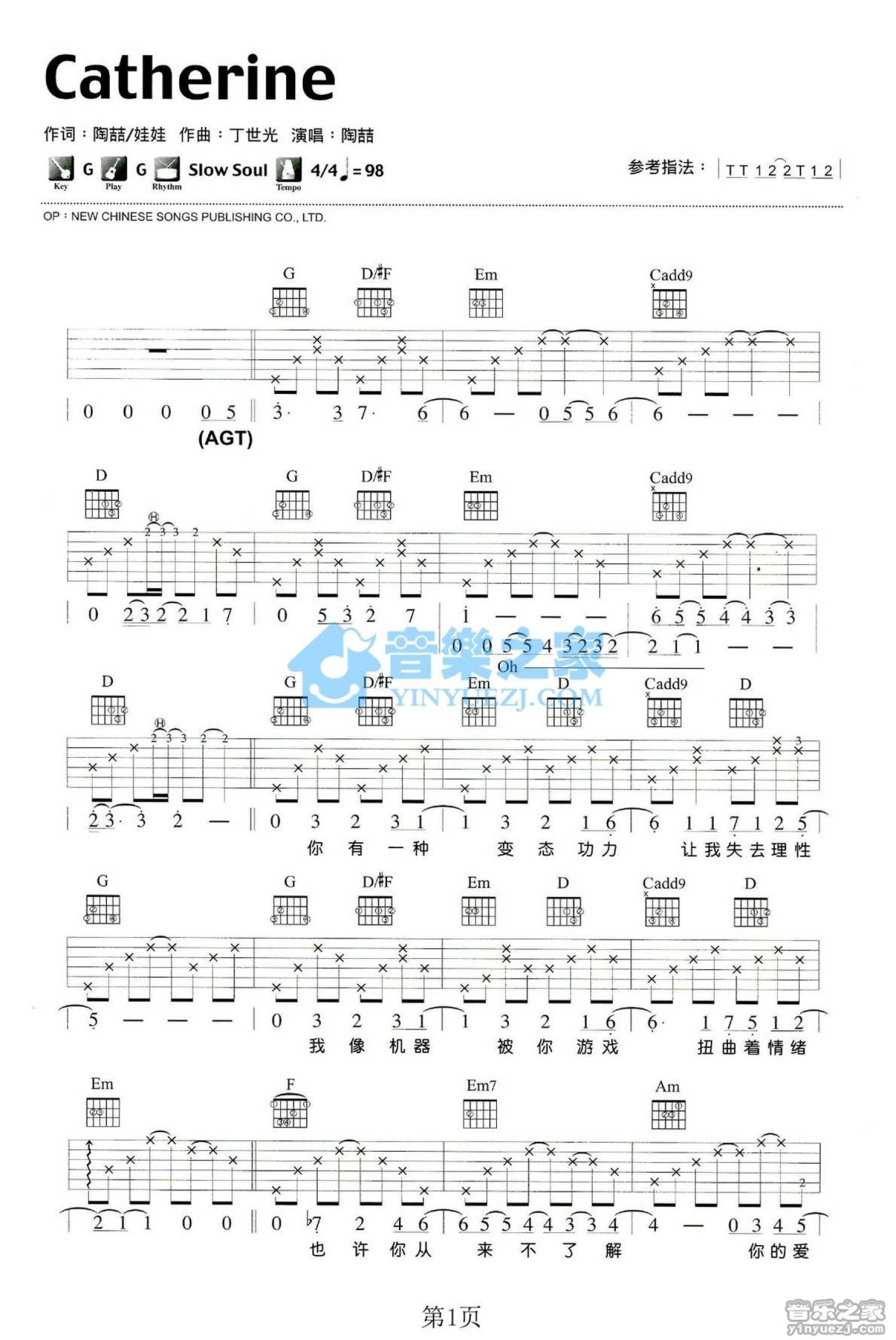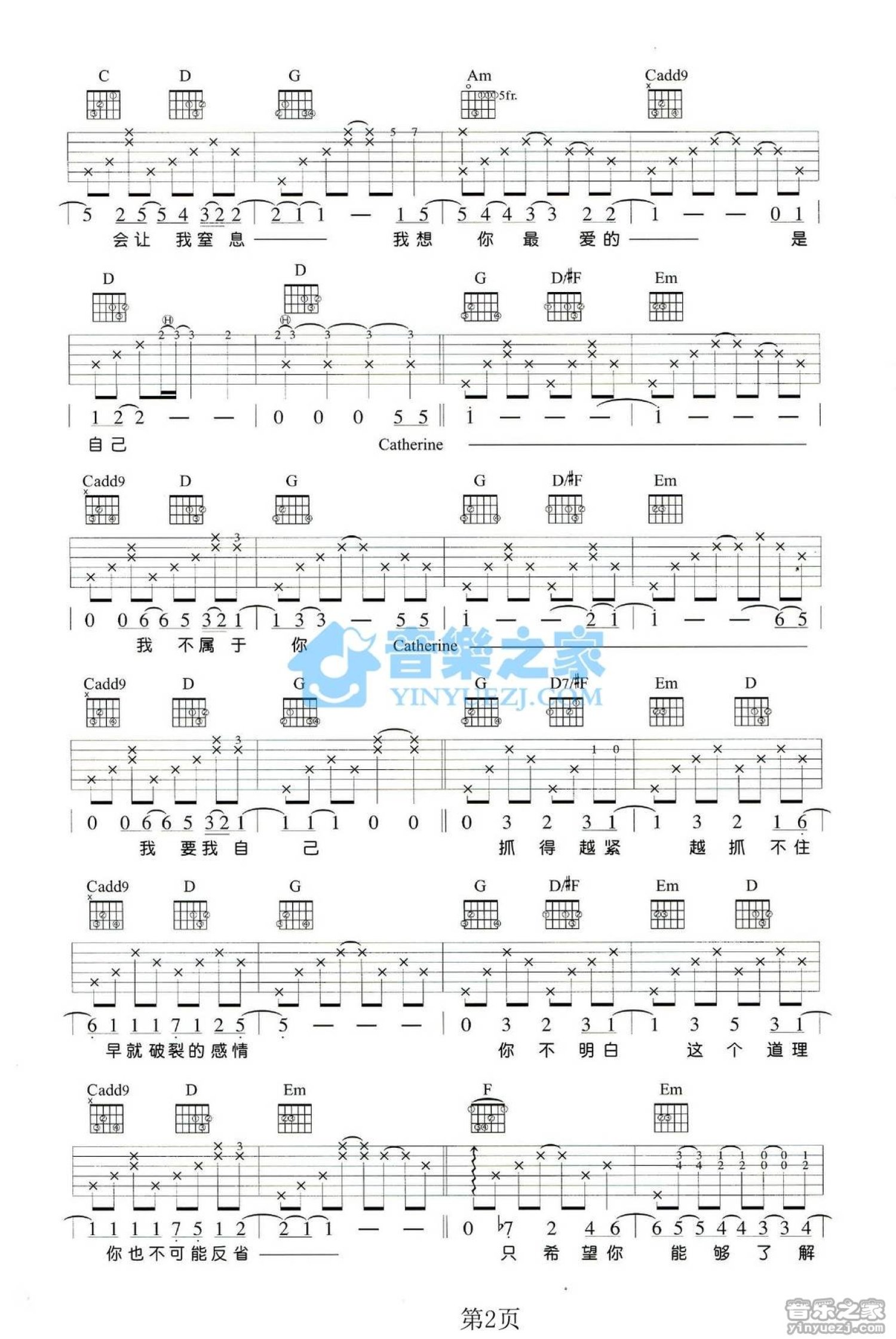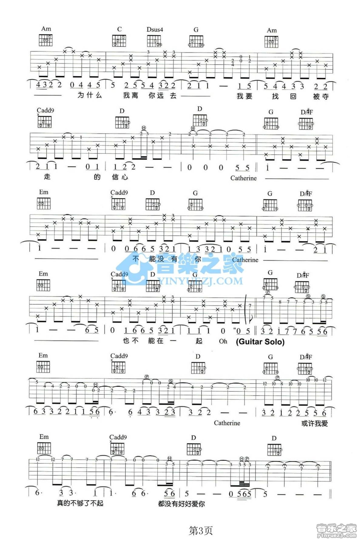 曲谱介绍: G调版陶喆Catherrine》吉他弹唱六线谱